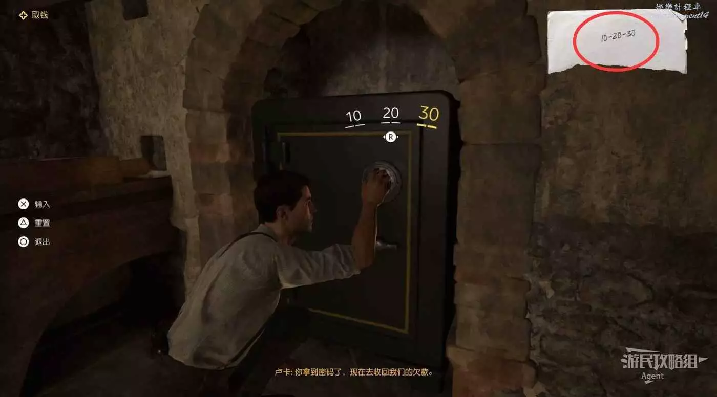 輸入密碼10-20-30打開保險箱拿到錢。