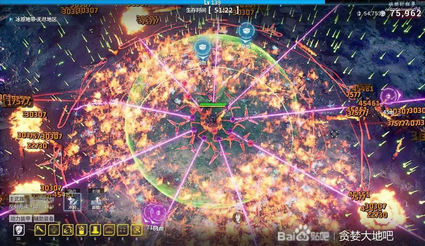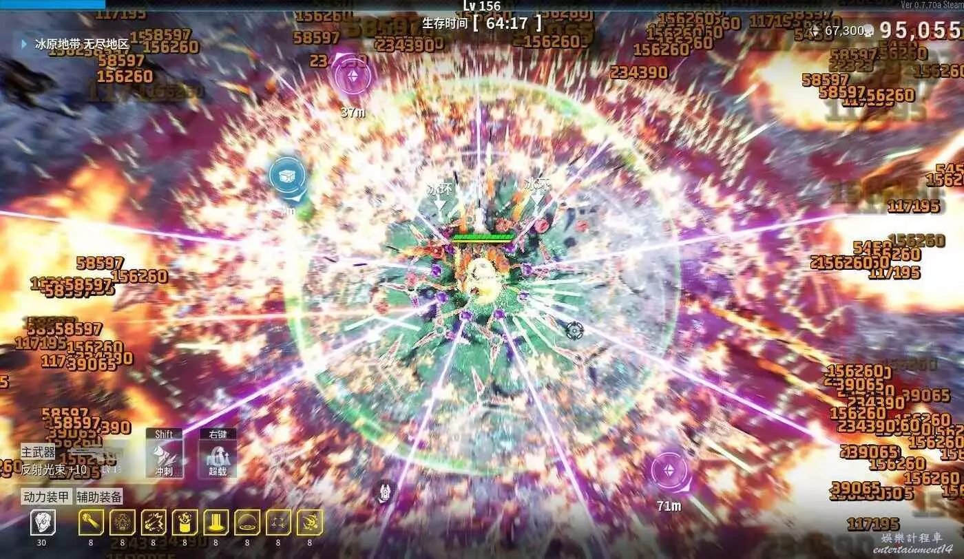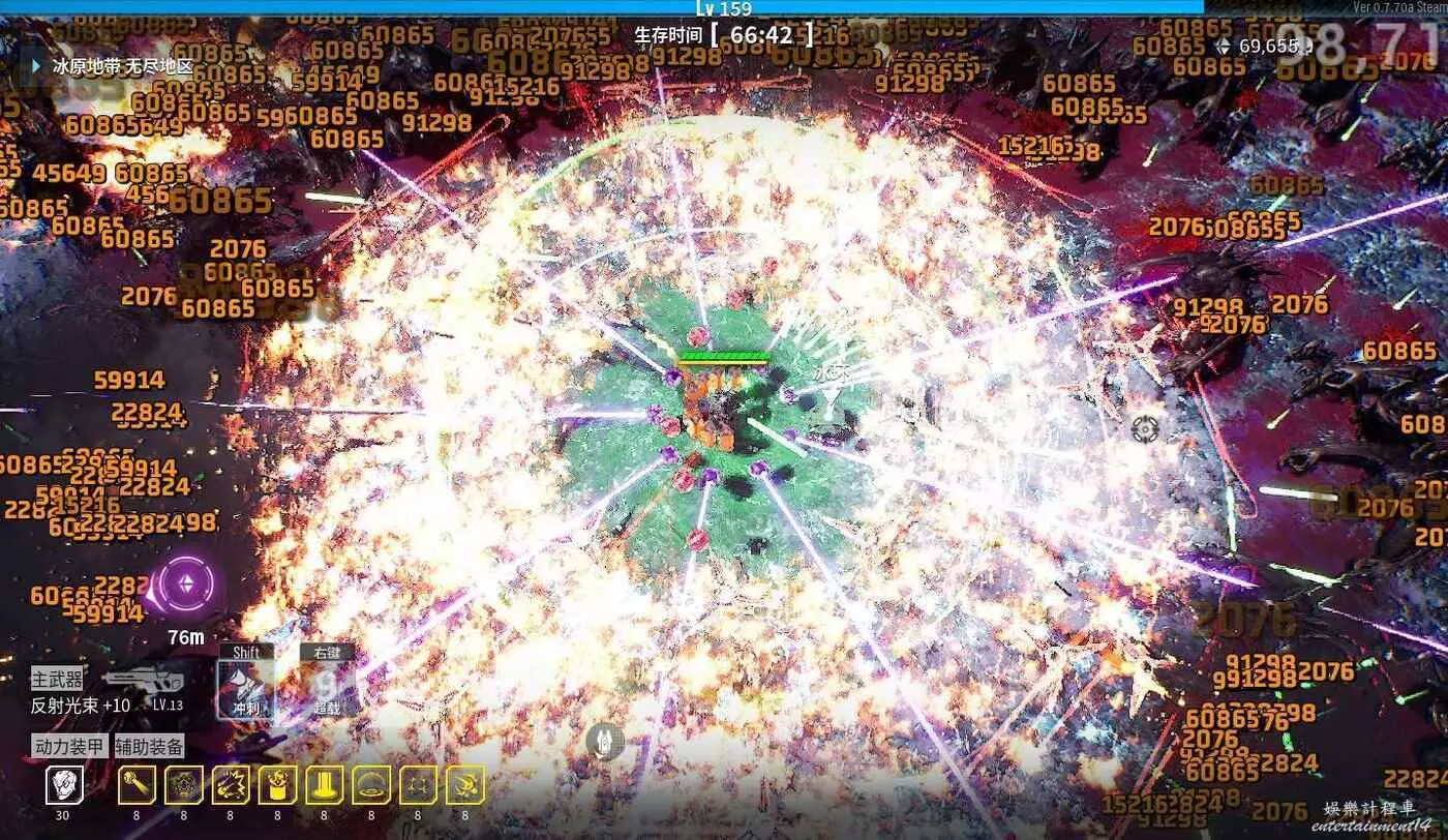 最後再說一下BOSS掉落的核心技能選擇,金色傳說只會出現4—5次,優先選增加2個輔助武器、增加50暴擊率和100暴擊傷害的,這兩個有了之後,可以不選暴甲重生、增加2個主武器子彈,而選紫色增加輔助武器100%傷害、紫色暴擊率,或紫色增加50%所有傷害。如果沒有選全金色輔助、金色暴擊那要優選先金色不選紫色,不然會把金色輔助、金色暴擊卡掉。然後紫色就是依次優先選增加100%輔助傷害 > 25暴擊50暴擊傷害 > 50%全傷害,反正就是主打一個增加輔助武器傷害。附上後期傷害值截圖(電磁炮6萬傷害)