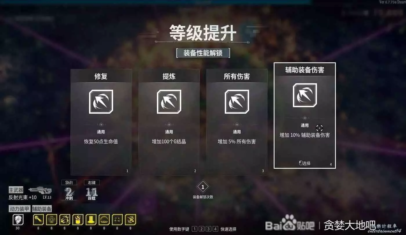 再說一下到後期所有主、副武器、視野、成長、貪婪滿級以後,就出現以上白色升級項,這時候剔除技能又用到了,剔除護甲,恢復,生命等選項,只留下4種,升級後必定會出現輔助武器傷害加10%的選項(如圖),這就是後期加傷害的主要辦法。