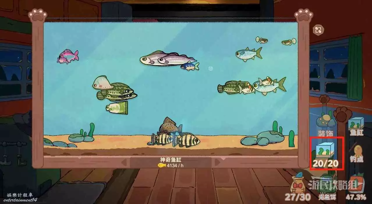 點擊魚缸並點擊右側的小魚缸圖示,挑選魚簍裡的魚將其放到魚缸內。