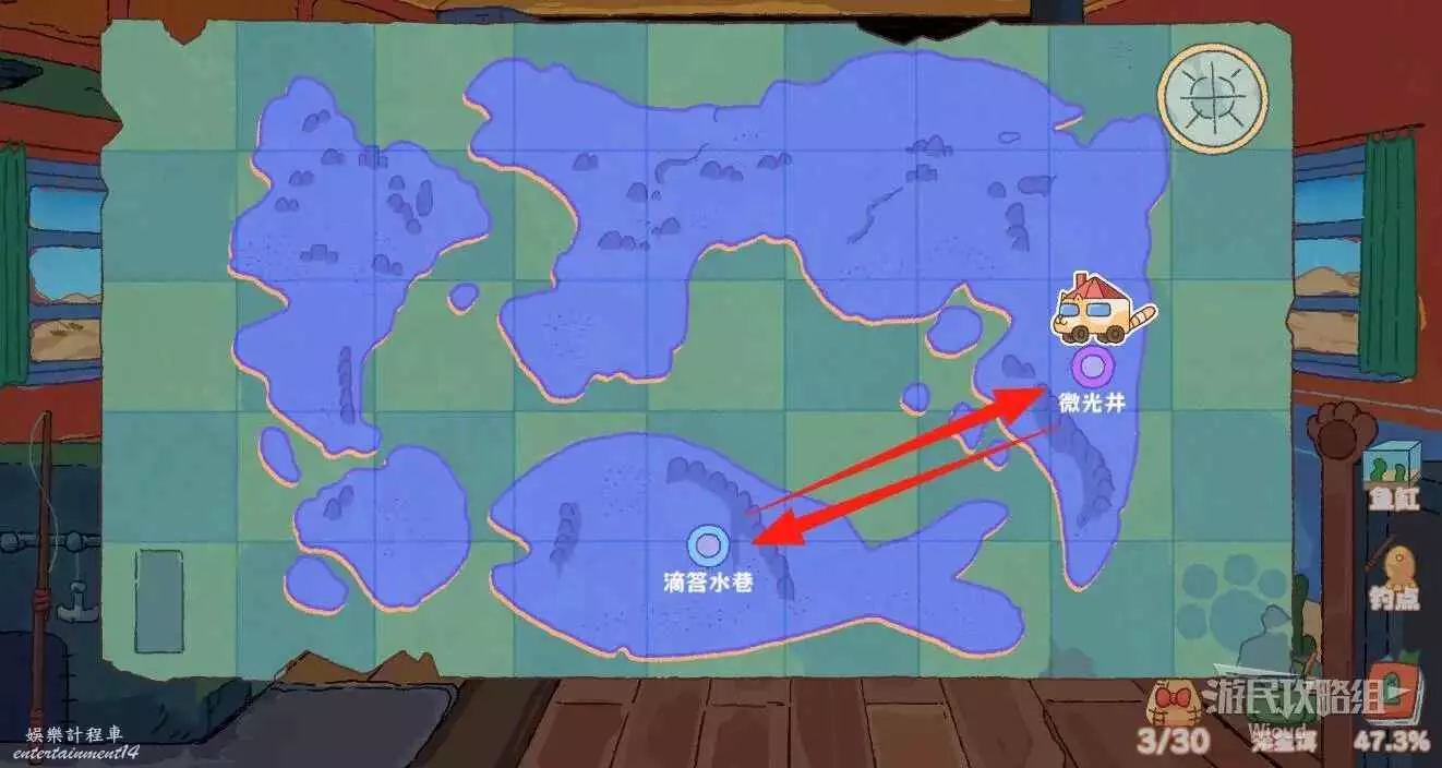 首先需要在第一張地圖提升相應的探索度,將商店等級提升至二級解鎖【釣點位置圖1】。