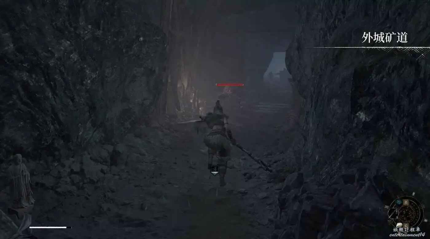 讓我們坐電梯下來回到寄死窟神龕處後繼續往前走右上角會提示現在我們來到外城礦道區域。擊敗前方敵人後快速清理掉旁邊的失心礦石,等待失心條下降消失後我們再繼續前進。