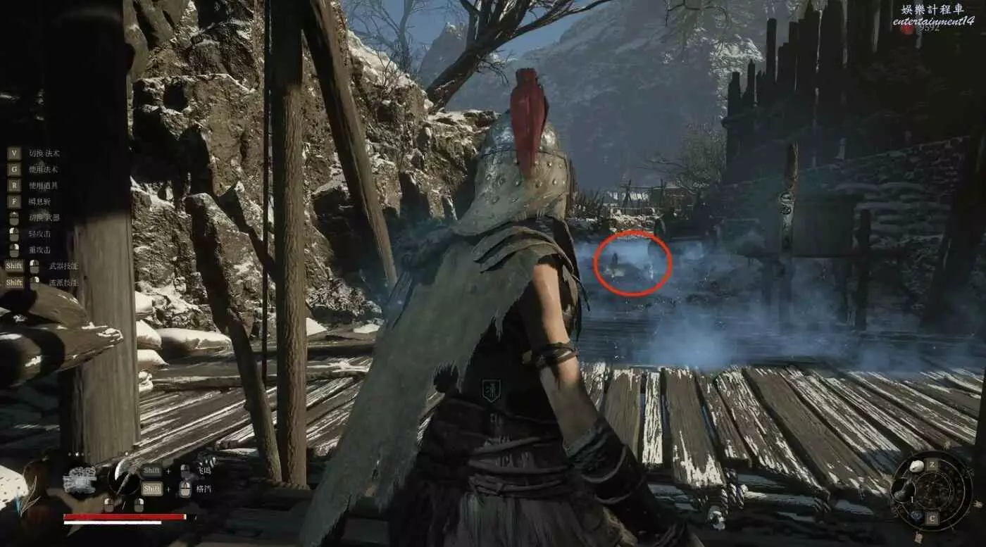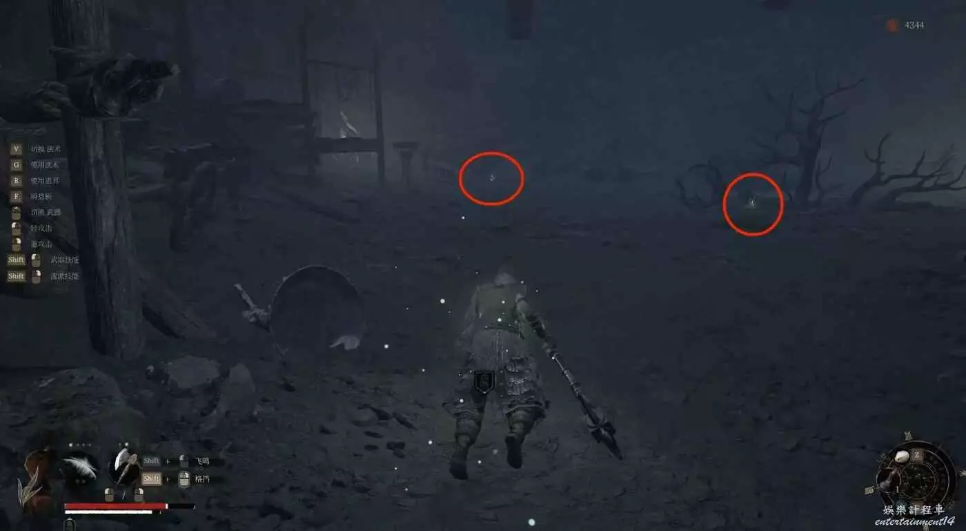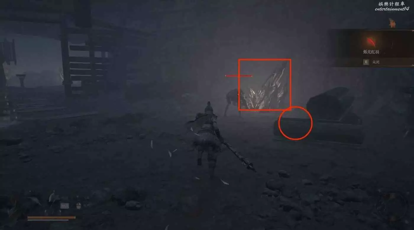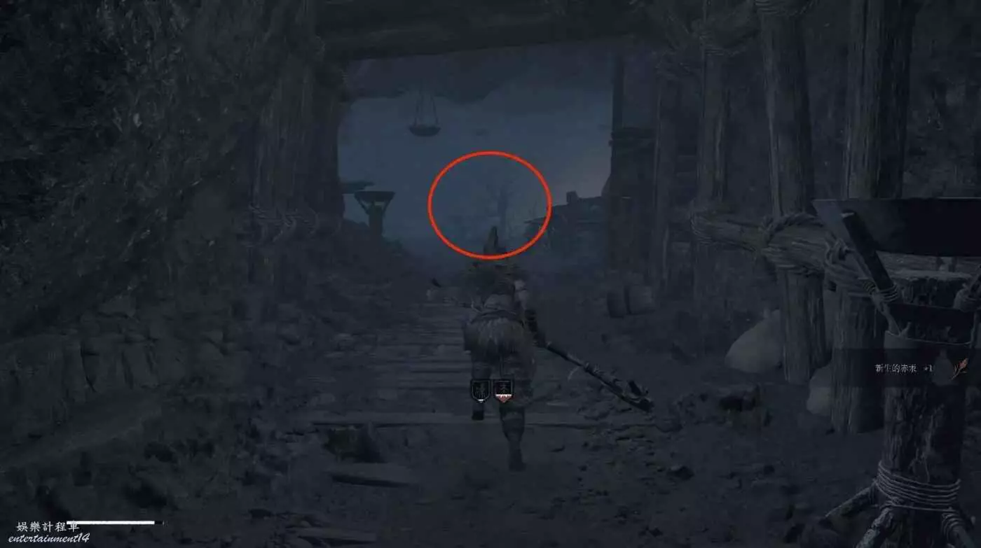 左側圓圈拾取【綠蓮子*2】,當要拾取右側拾取物的時候樹精會從地下鑽出,我們快速後退回礦道內拉開距離,樹精身材高大無法進入礦道,只能使用植物路徑攻擊我們,注意躲避時機即可,使用【火油彈】將樹精點燃後卡在礦道口處攻擊將其擊敗。擊敗後拾取圓圈處【爍光紅羽】,和【暗淡紅羽】作用一樣用於強化武器,但是【爍光紅羽】是把武器從+3強化到+6的強化道具。前方怪物旁邊拾取【清心蓮子*2】。