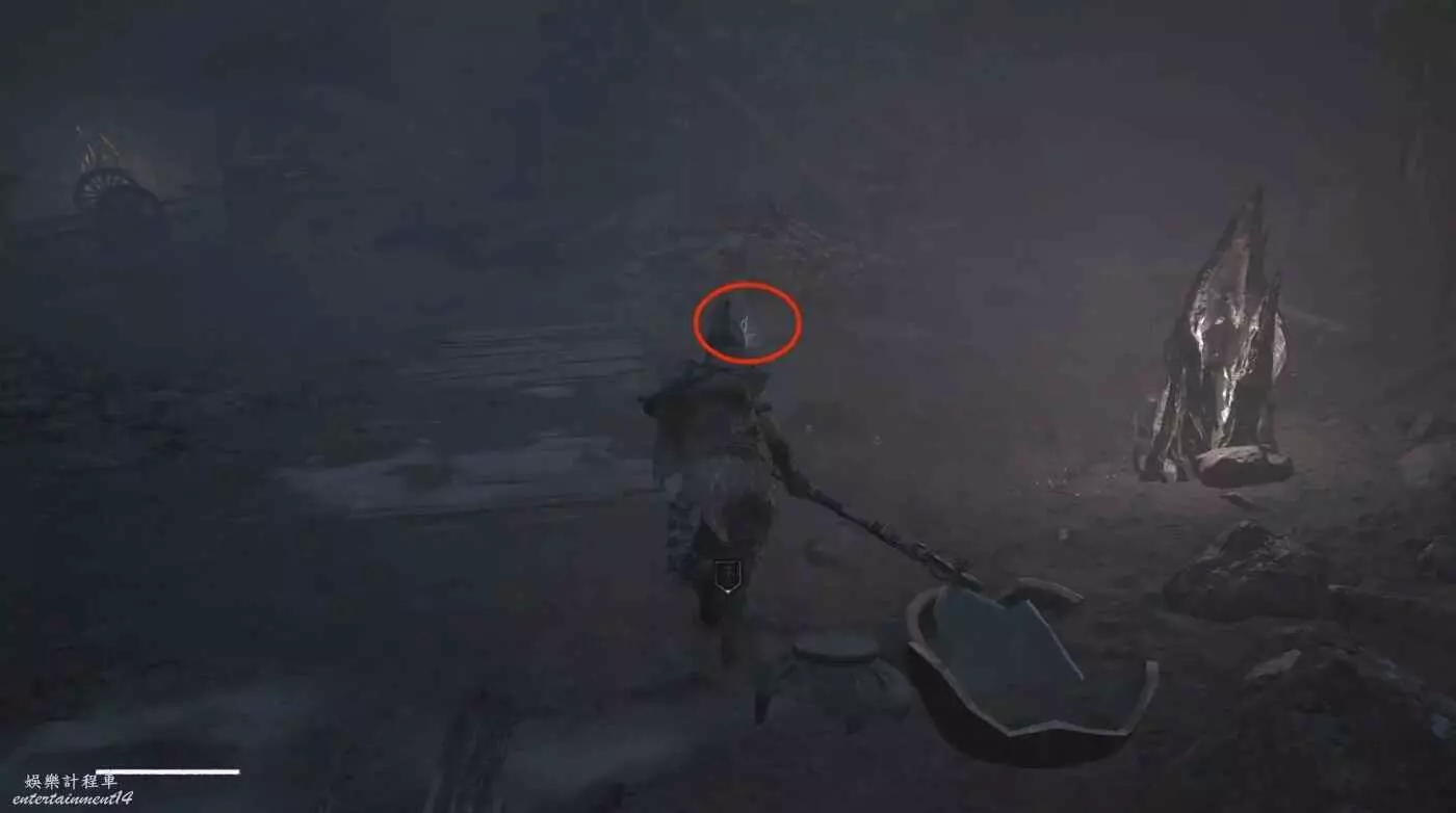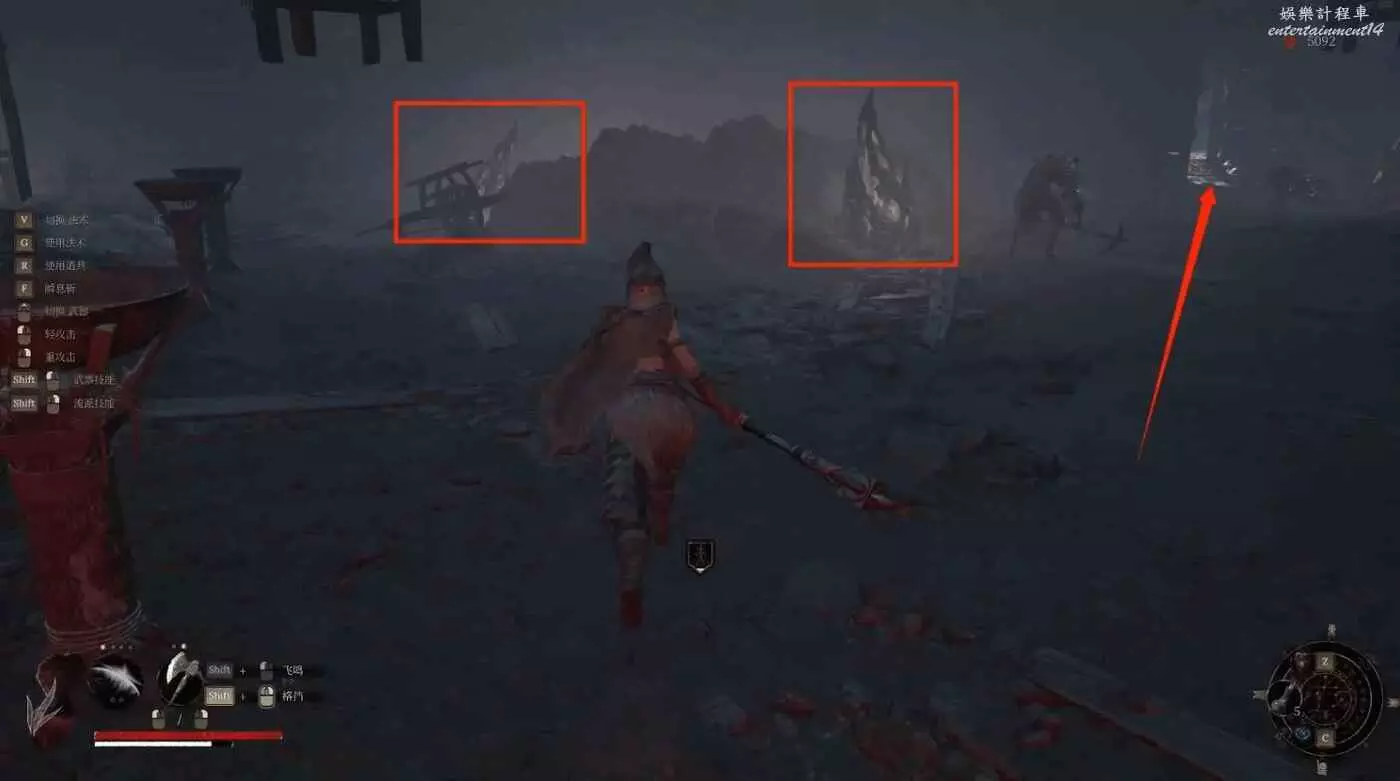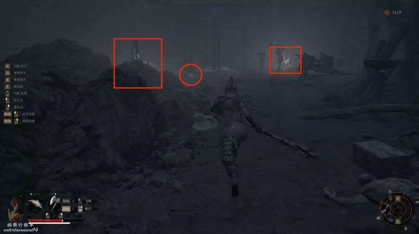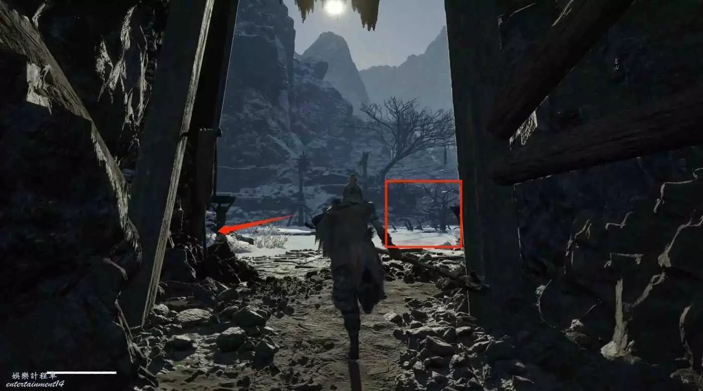 往前走出礦洞方框位置有樹精敵人,這名樹精敵人我們依舊使用火油彈擊殺。敵人前方的箱子拾取先神之言【伐·連擊·引火】。左側箭頭處電梯通往大西軍營地(注意電梯前有兩個地雷),電梯前屍體處拾取【小藥丸*1】。