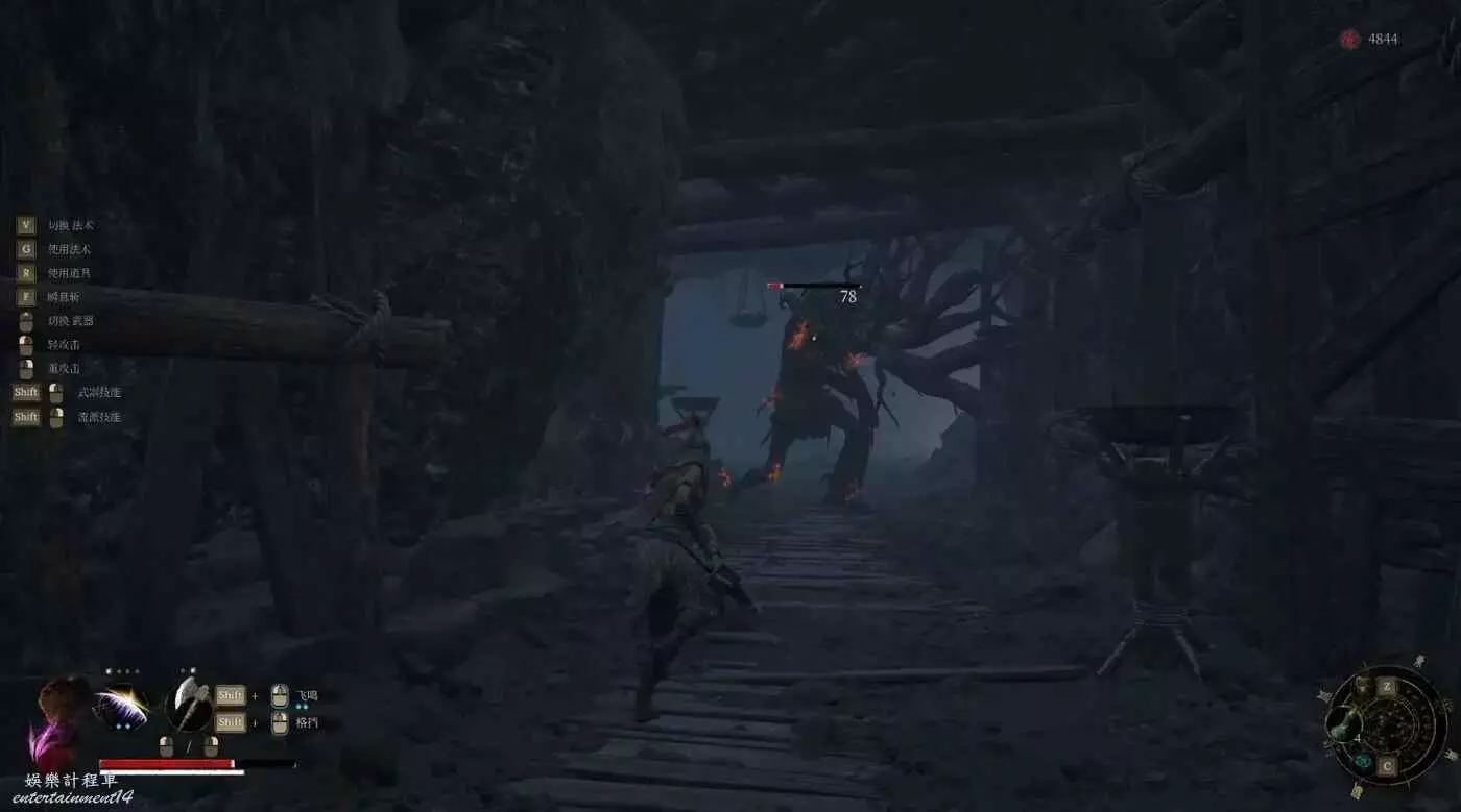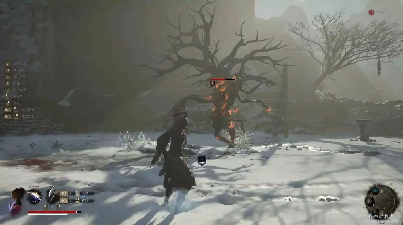 前方不要貿然前進,圓圈處是一名樹精敵人,我們靠近後它就會起身攻擊我們,戰鬥前先調整好快速物品欄準備好【火油彈】。