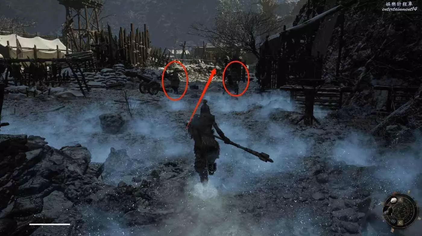 注意圓圈區域兩名大西軍敵人需要快速拉近距離擊敗,他們會使用面前的大炮轟擊我們,擊敗敵人後旁邊的彈藥箱拾取【開花彈*5】,有了開花彈我們也可以和大炮互動來攻擊敵人,但是大炮無法改變開火方向比較雞肋。