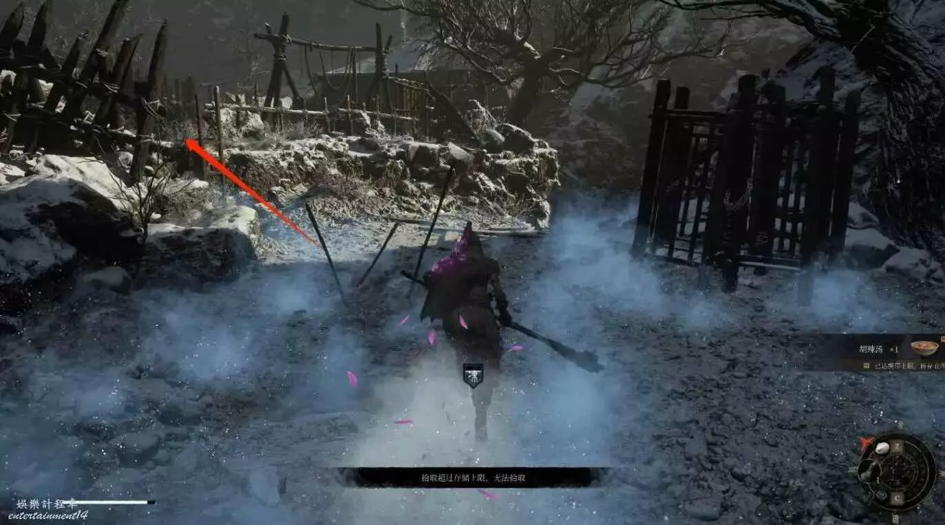 右側拾取圓圈處拾取【清心蓮子*2】,小心左側箭頭處自爆敵人,敵人飛撲時我們可以閃避規避傷害。