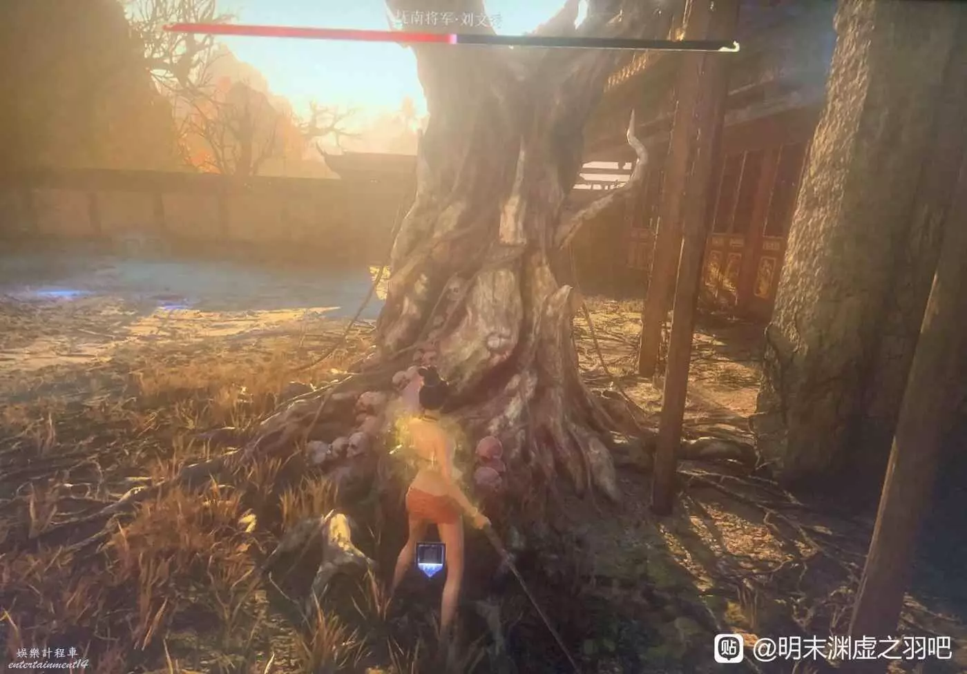 進門之後不要鎖定,吸引仇恨後把他引到牆邊的大樹邊,只要你不往左邊走他是不會繞過來打你的,然後他會在大樹中間柱子那裡無腦攻擊而無法過來,此時你只要調整好距離用長武器輸出即可,注意太近也會被他打到,他的五雷轟頂和火槍依然是可以打到你的,但是已經變為簡單難度了,輕鬆輸出即可過,有興趣的玩家可以試下。