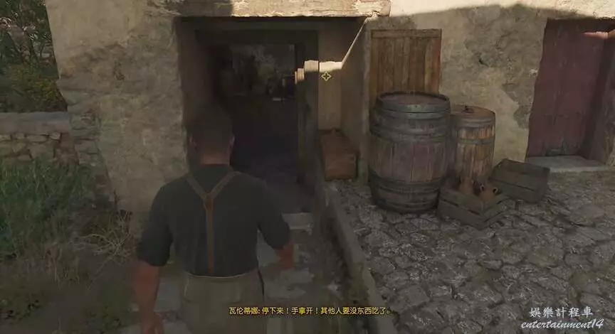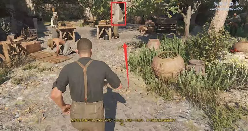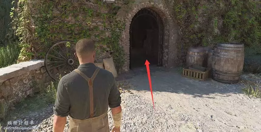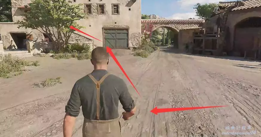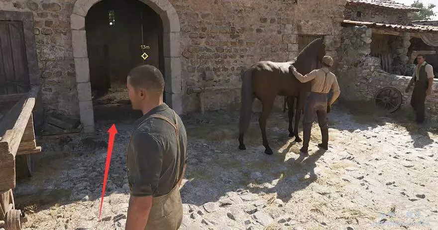 玩家推進主線任務到清理馬廄的位置,順著下圖箭頭所示的方向進入前面的建築裡。