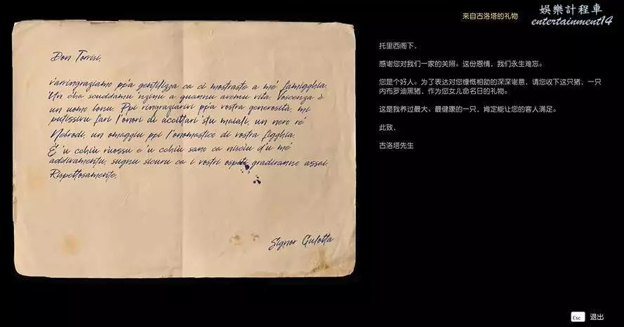 您是個好人。為了表達對您慷慨相助的深深謝意,請您收下這隻豬,一隻內布羅迪黑豬,作為您女兒命名日的禮物。