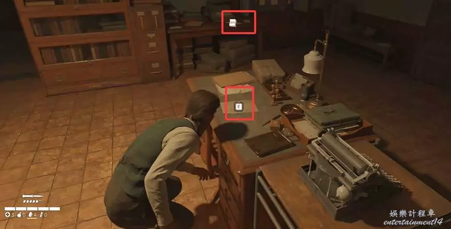 往左邊走去開門。然後一直往左邊走到下圖所示的辦公室裡。這裡有個敵人會離開,別急。