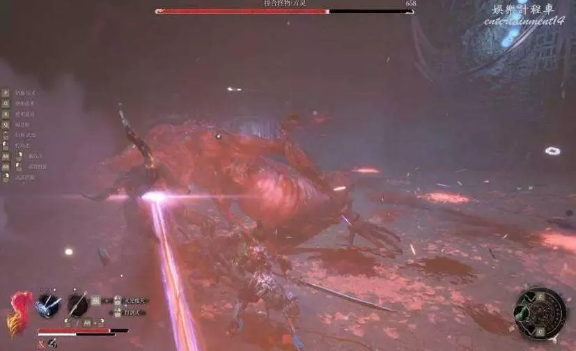 拼合怪物抬頭向空中噴射鐳射,召喚多個隕火陸續墜落。貼身容易避免,還能順便多砍幾下。
