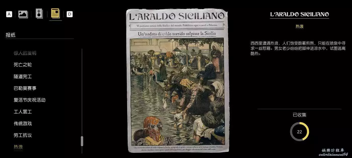 四海兄弟 故鄉 熱浪報紙位置介紹 13 8 月 2025-08-13 廣告 來源:互聯網 1、進入科萊佐爾福正下方箭頭所指位置。 2、進入地圖,從這個大門進入。 3、往箱子位置走,然後繼續往右前方走。 4、一直繞到遠處帳篷位置。 5、玩家只要路過帳篷,報紙就在右邊門洞位置。 熱浪 西西里遭遇熱浪,人們飽受酷暑煎熬,只能在噴泉中尋求一絲慰藉。 男女老少紛紛把腳伸進涼水中,試圖逃離酷熱。