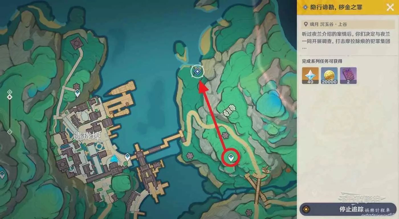 第一關目標位置在沉玉谷東北邊,遺瓏埠的右上角。可以通過空中的光點快速前往。