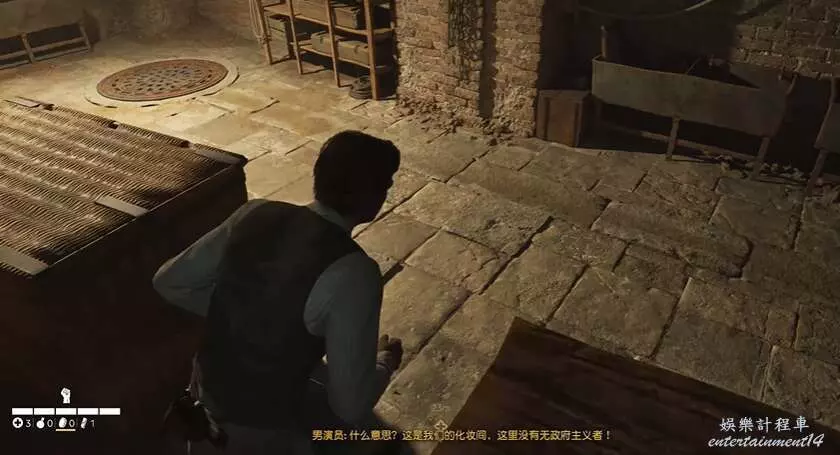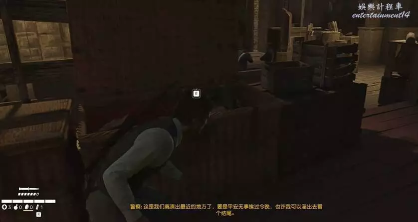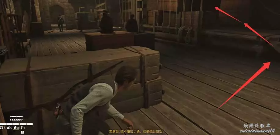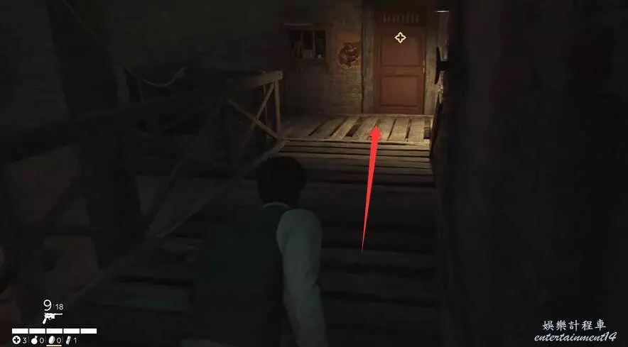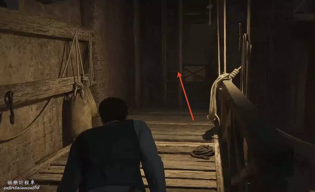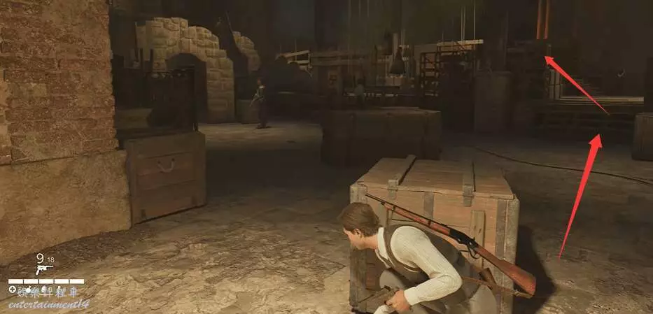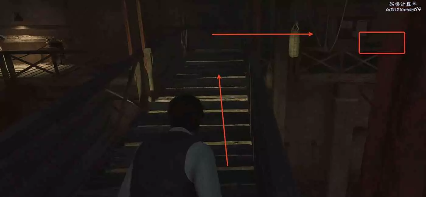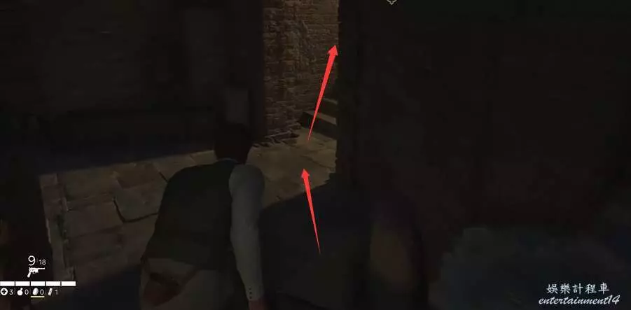 玩家拿到夜間執勤指示後,注意潛行,順著下方箭頭的方向走。