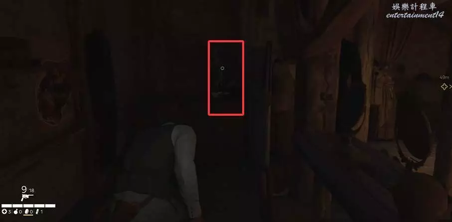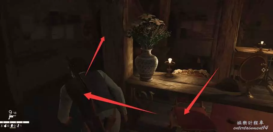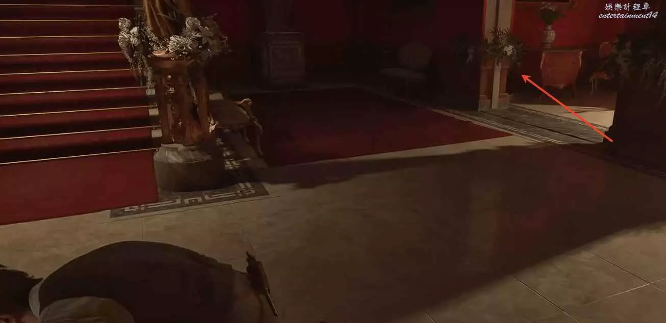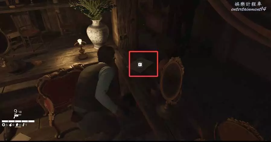 到下圖所示位置時,先別進去任務點指示的門,門左邊的椅子上有拾取點。