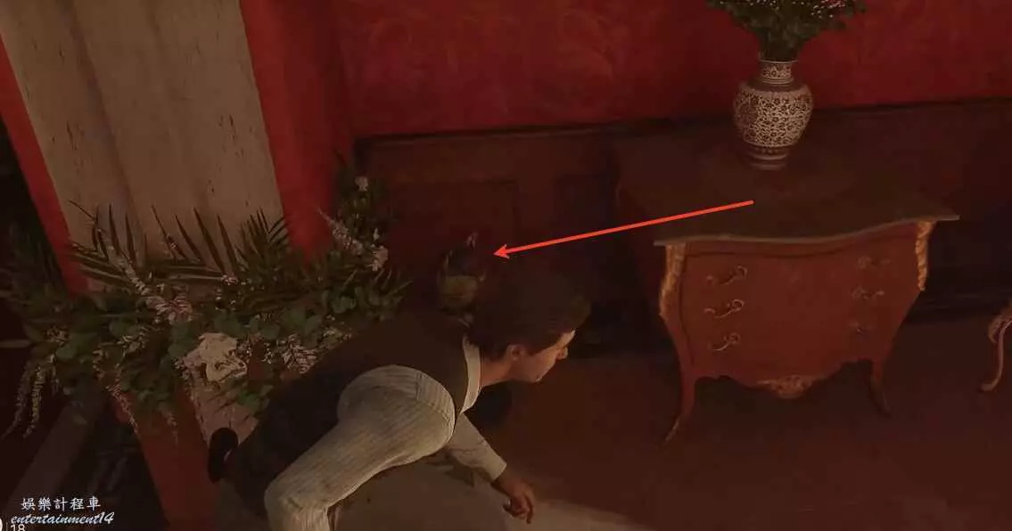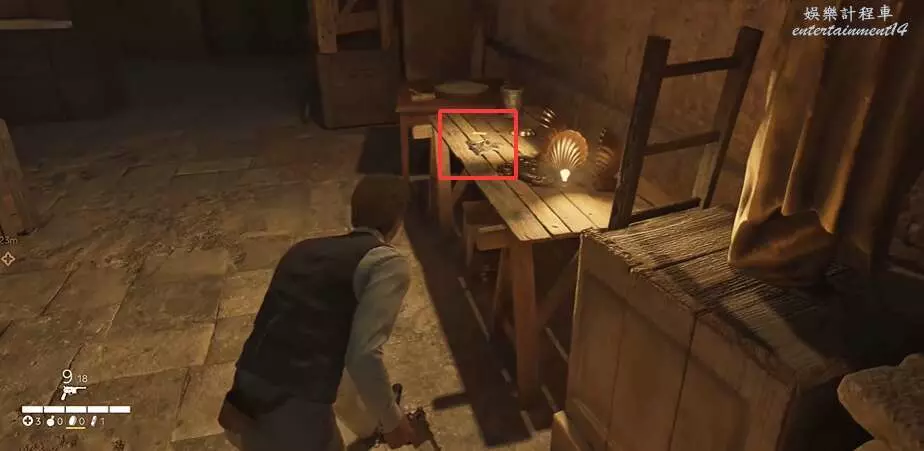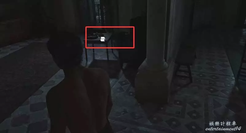 玩家推進主線任務到換身衣服,面朝衣櫃往前走,注意右手邊的桌子。