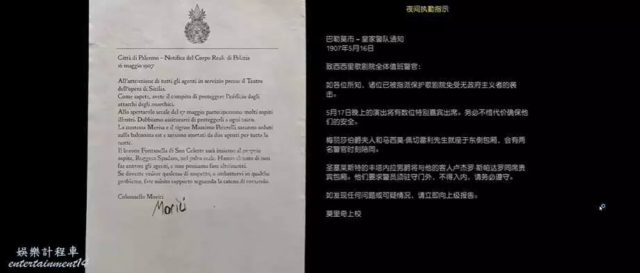 梅麗莎伯爵夫人和馬西莫·佩切雷利先生就座於東側包廂,會有兩名警官時刻陪同。