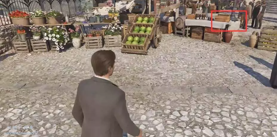 拿到報紙之後跟伊莎貝拉聊天,之後跟著她走,要到裝西瓜的推車那裡去。