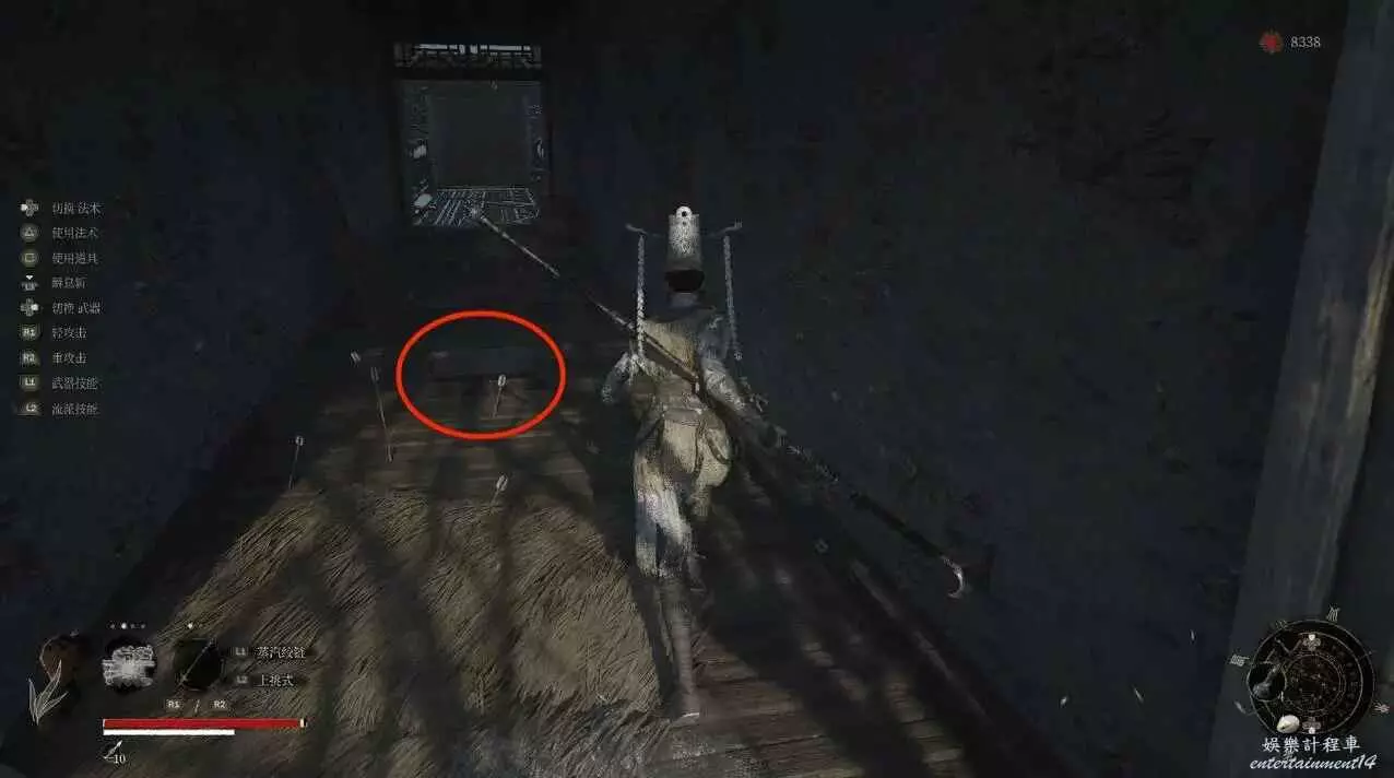 穿過屋子繼續往前左側圓圈處箱子拾取先神之言【伐·燃燒·引火*1】,拾取時注意右側箭頭處有一名敵人偷襲。