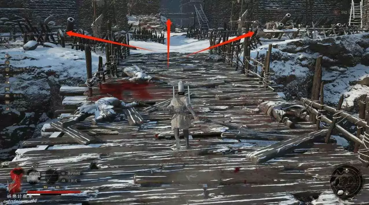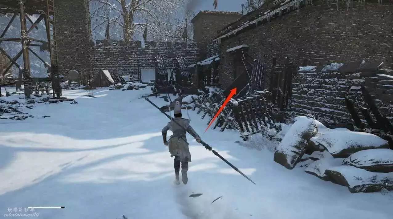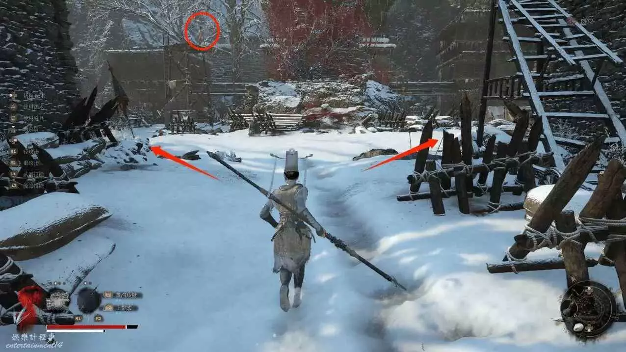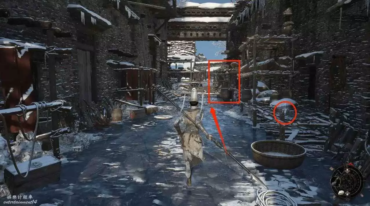 擊敗劉承恩後我們沿著木橋繼續前進,記得先把獲得的赤汞提煉成赤汞精華並使用哦。前方直走是主路,右側牆邊木架子上拾取【猴兒釀*1】,左側區域沒有東西可以不用前往。拾取後走中間主路進城,這片區域明軍敵人數量較多,我們可以使用神火長槍,一方面手持神火長槍可以降低寒冷條,另一方面神火長槍的武器技能和上挑式都比較好對付強大的人形敵人。