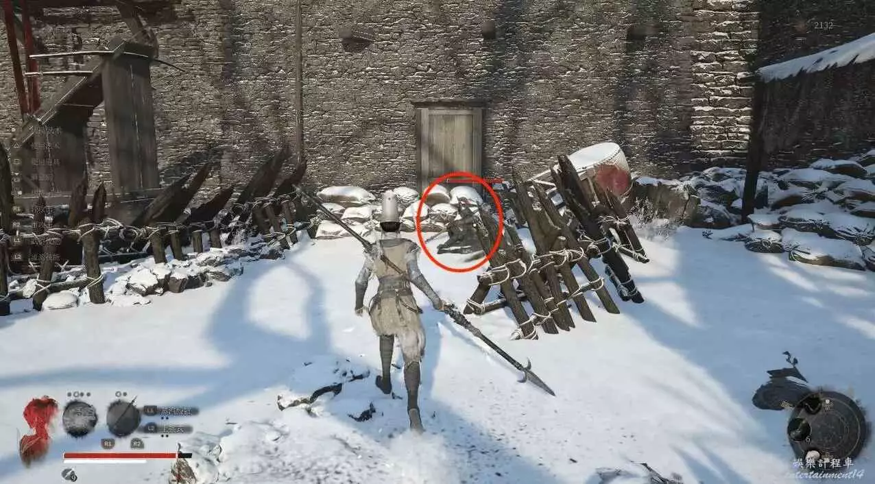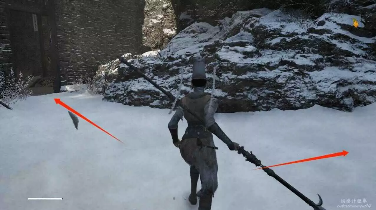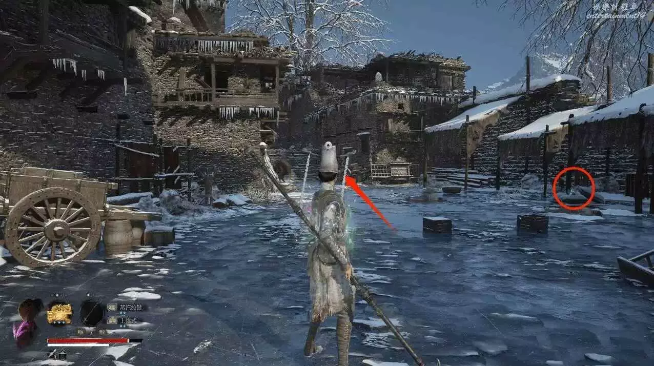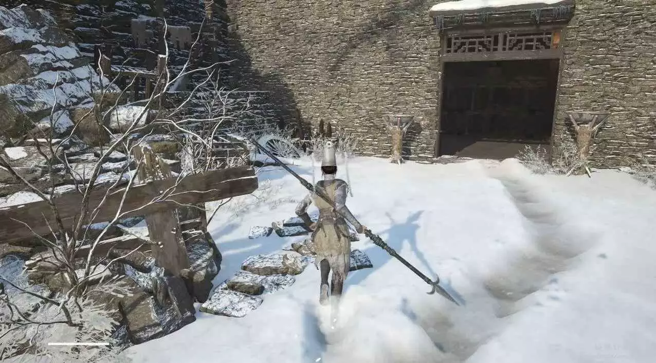 擊敗劉承恩後我們沿著木橋繼續前進,記得先把獲得的赤汞提煉成赤汞精華並使用哦。前方直走是主路,右側牆邊木架子上拾取【猴兒釀*1】,左側區域沒有東西可以不用前往。拾取後走中間主路進城,這片區域明軍敵人數量較多,我們可以使用神火長槍,一方面手持神火長槍可以降低寒冷條,另一方面神火長槍的武器技能和上挑式都比較好對付強大的人形敵人。