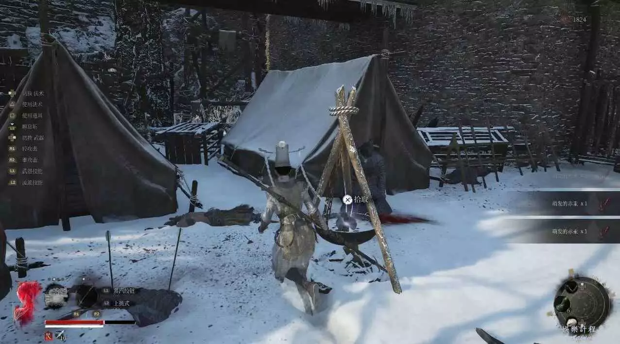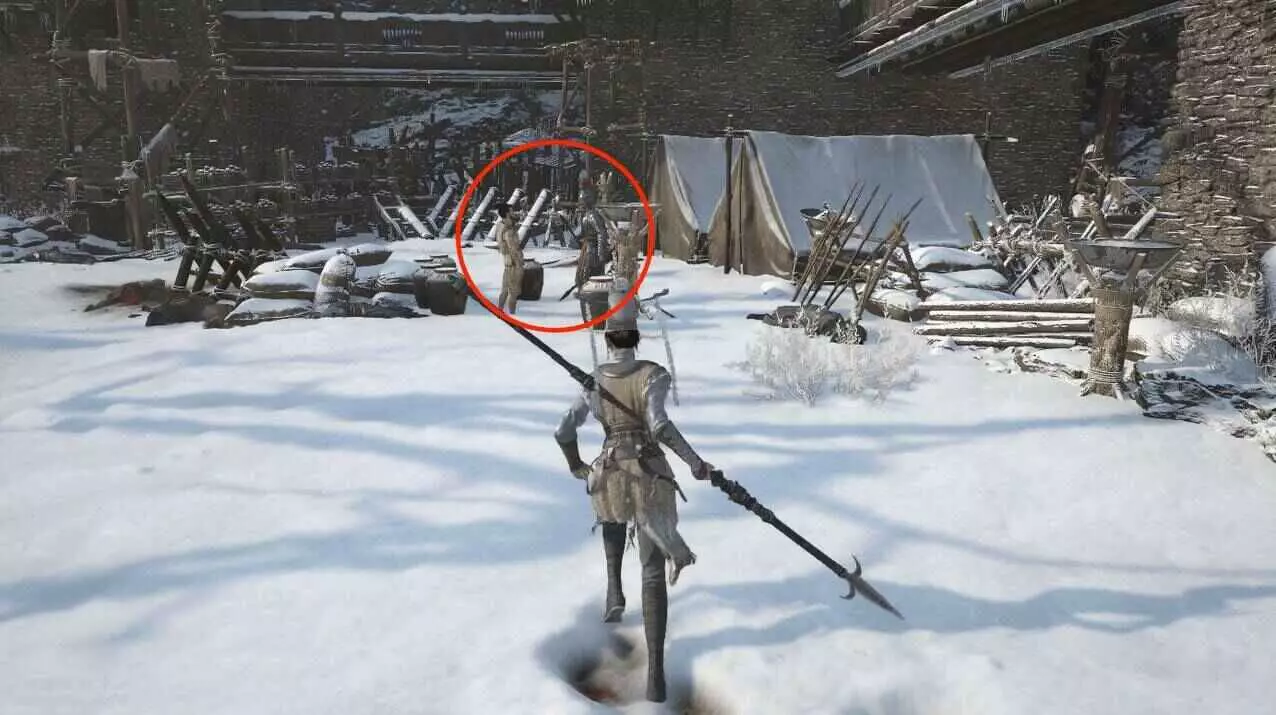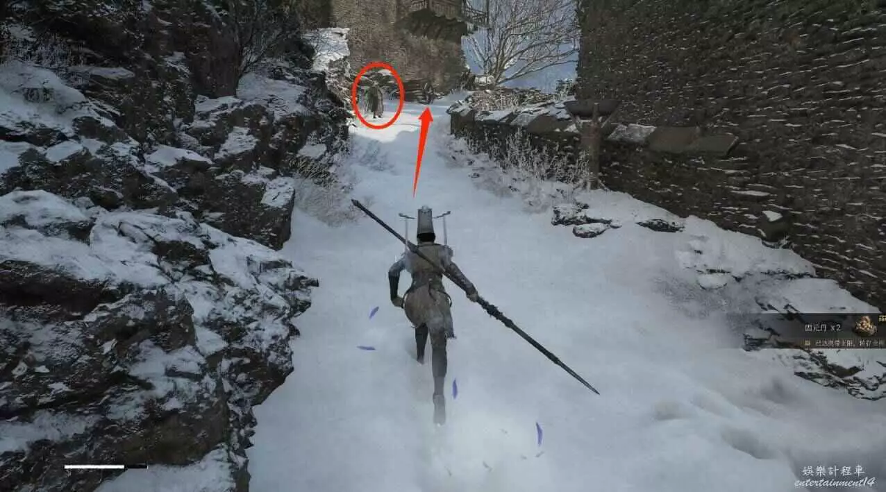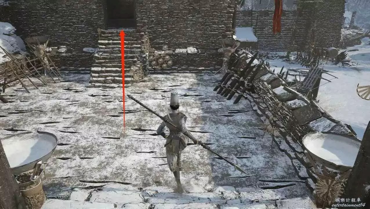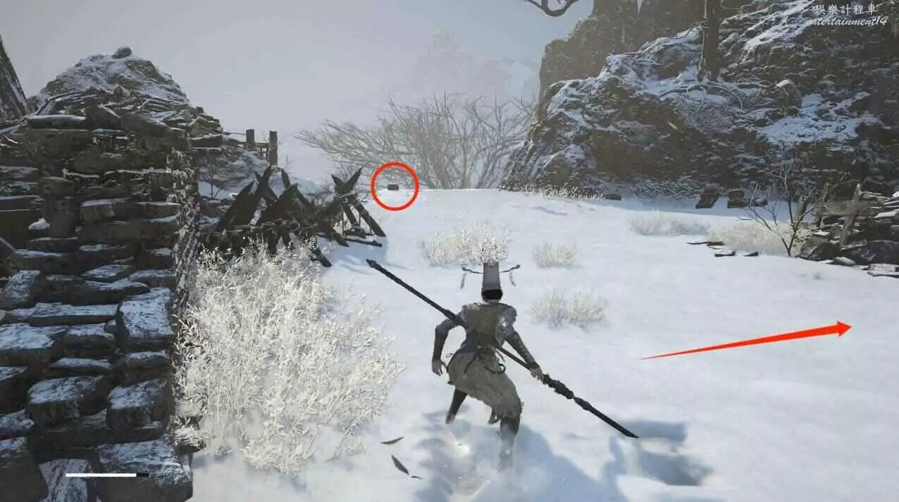 擊敗後我們先走右側箭頭處有一名在休息的明軍我們需要率先擊敗,如果我們不管他接著往前走他會從後面偷襲我們,不清楚敵人方位的情況下可以經常按索敵鍵(滑鼠中鍵,手把R3鍵)來確認敵人位置。這名敵人我們可以繞後破刹擊殺,身邊拾取【新生的赤汞*1】。