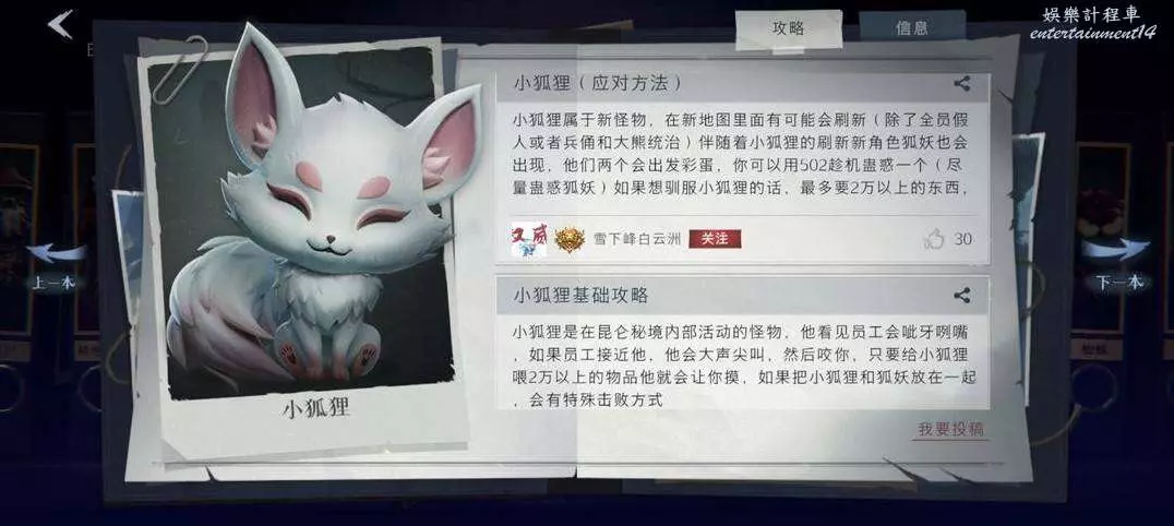 基礎資訊:只在昆侖雪山出現,撫摸會攻擊,投喂後不咬人並帶你找金,被擊殺後召喚狐妖不死不休,與狐妖相遇會有動畫,投喂完抱狐狸時遇到狐妖攻擊觸發雙方消失