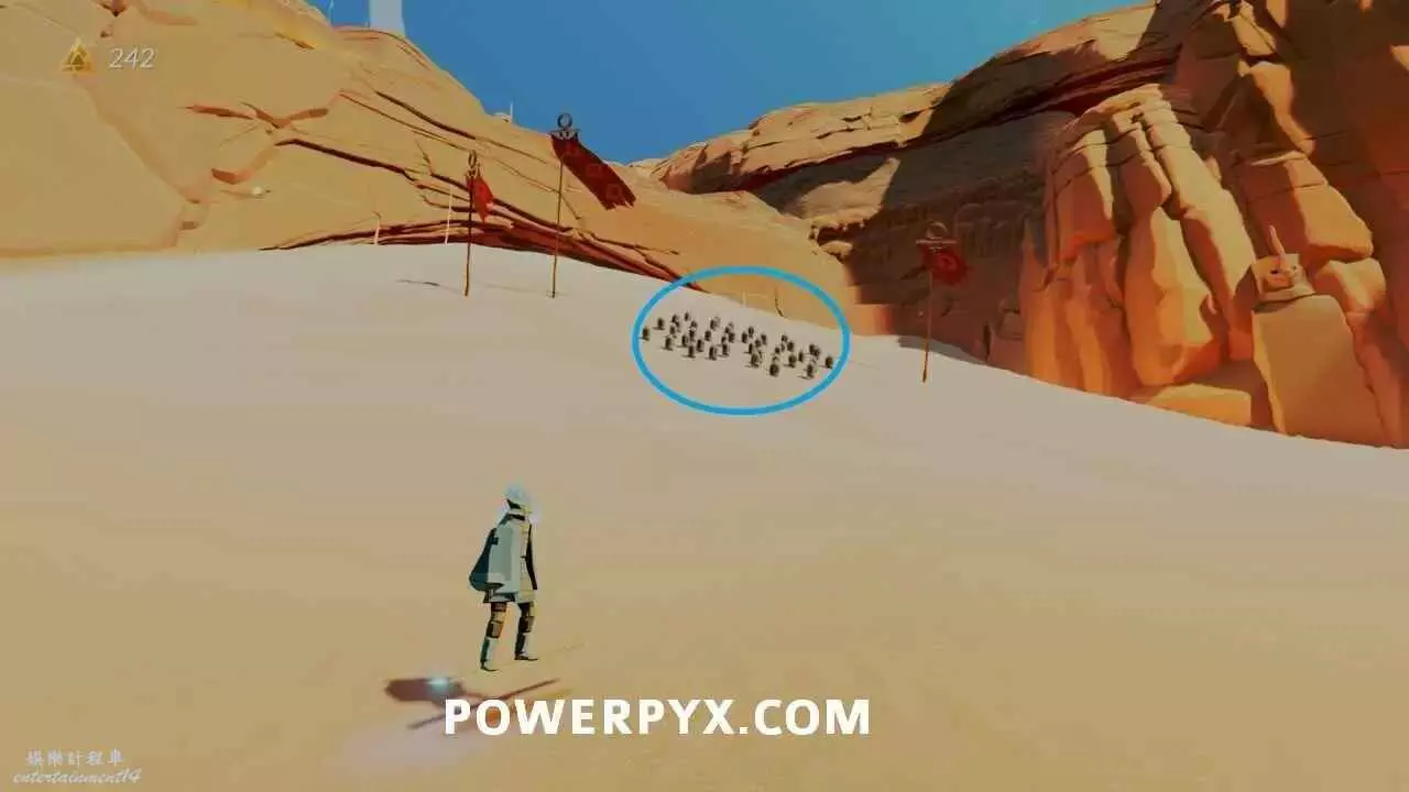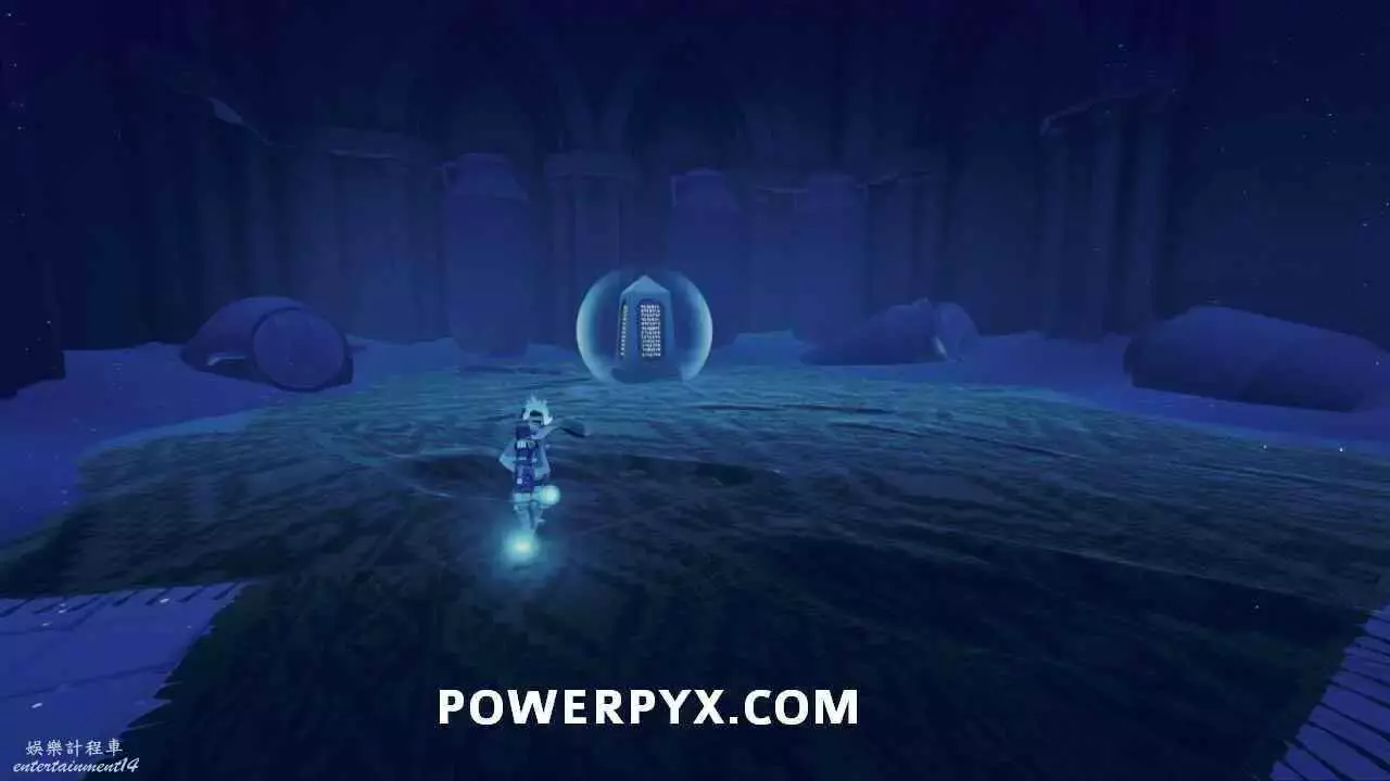 沿著左側岩壁往前走可以看到斜坡上有一堆燈籠,點亮燈籠進入洞穴,繼續前進並點亮第二堆燈籠,排光沙子後,沿著左側道路進入洞穴到達出水點,與壁畫右側石板互動。