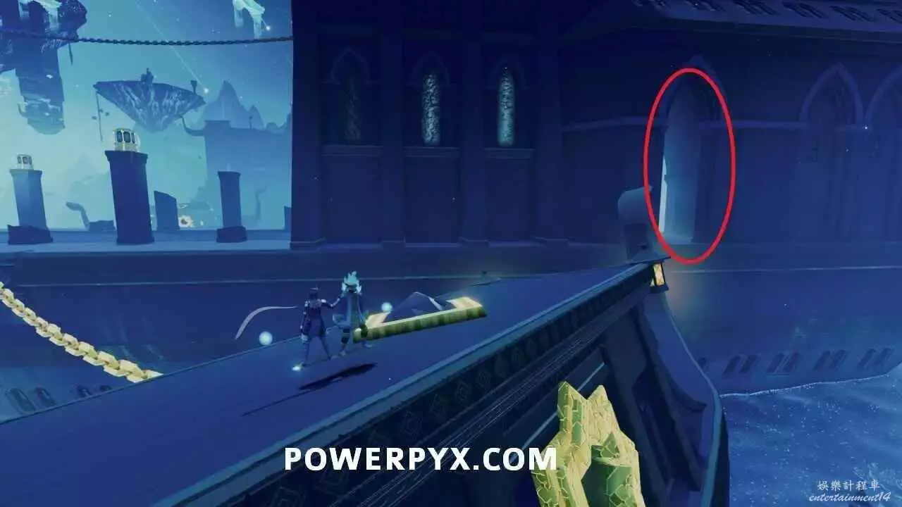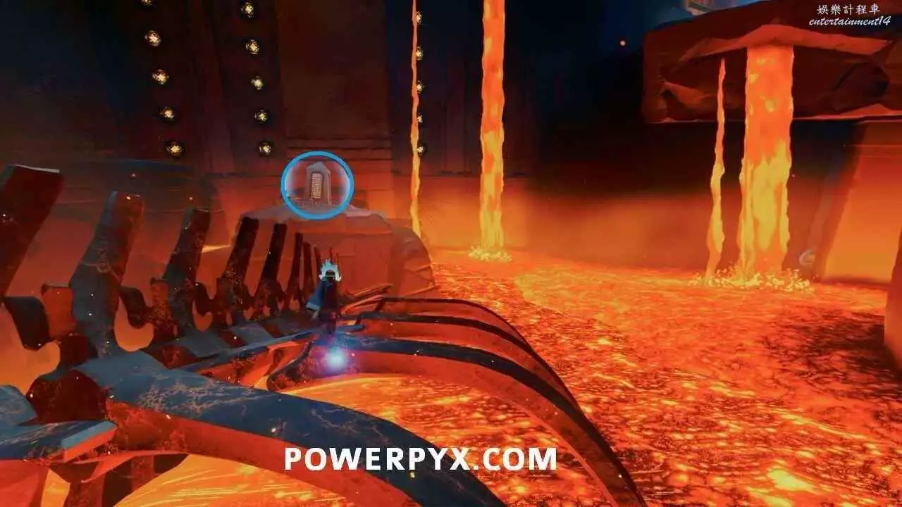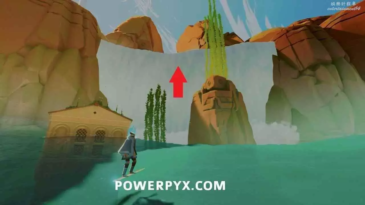 啟動右側鏈條的出水點,繞道建築後方將海水歸位,沿著海草往上爬到瀑布頂端,繼續沿路往前走即可到達石板所在平台。