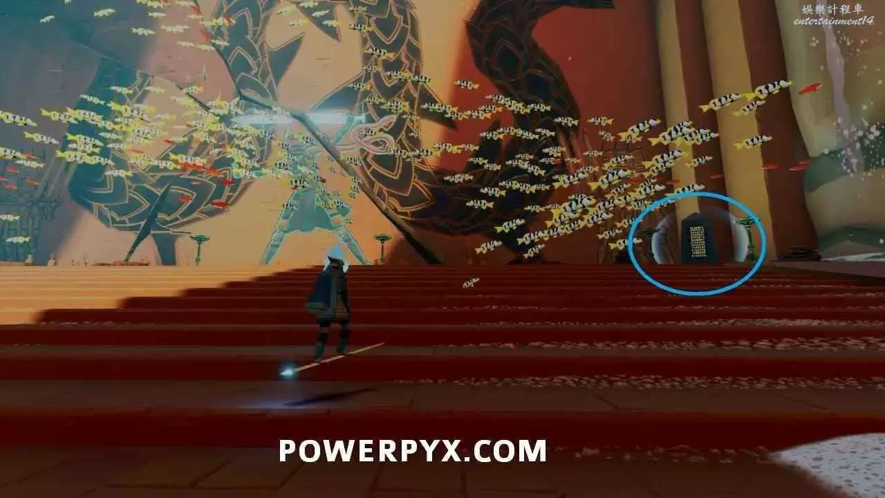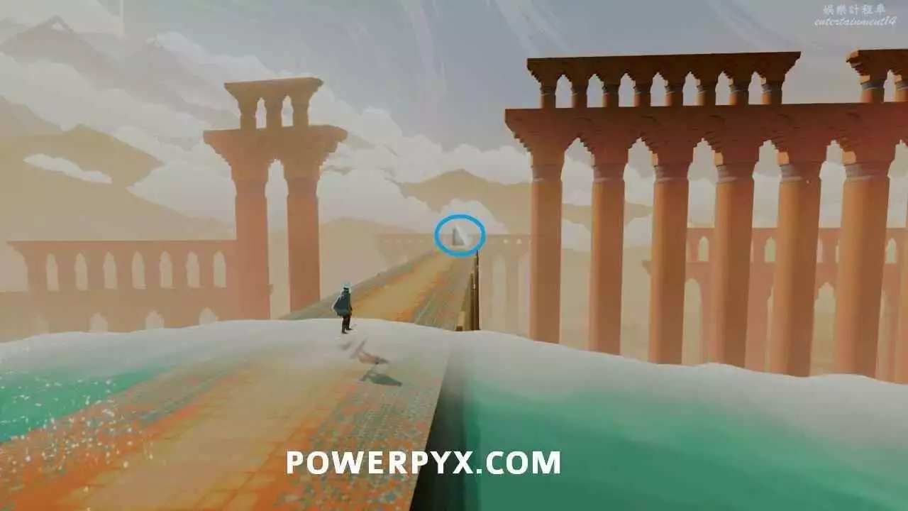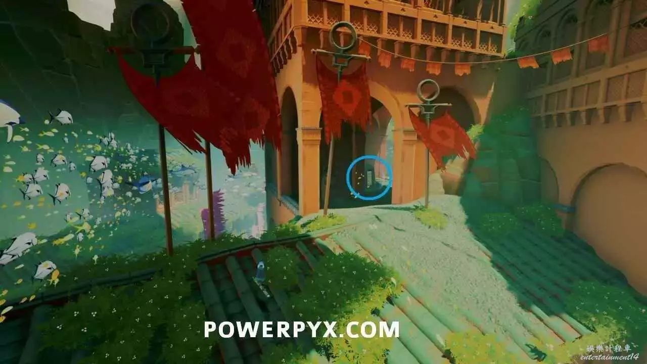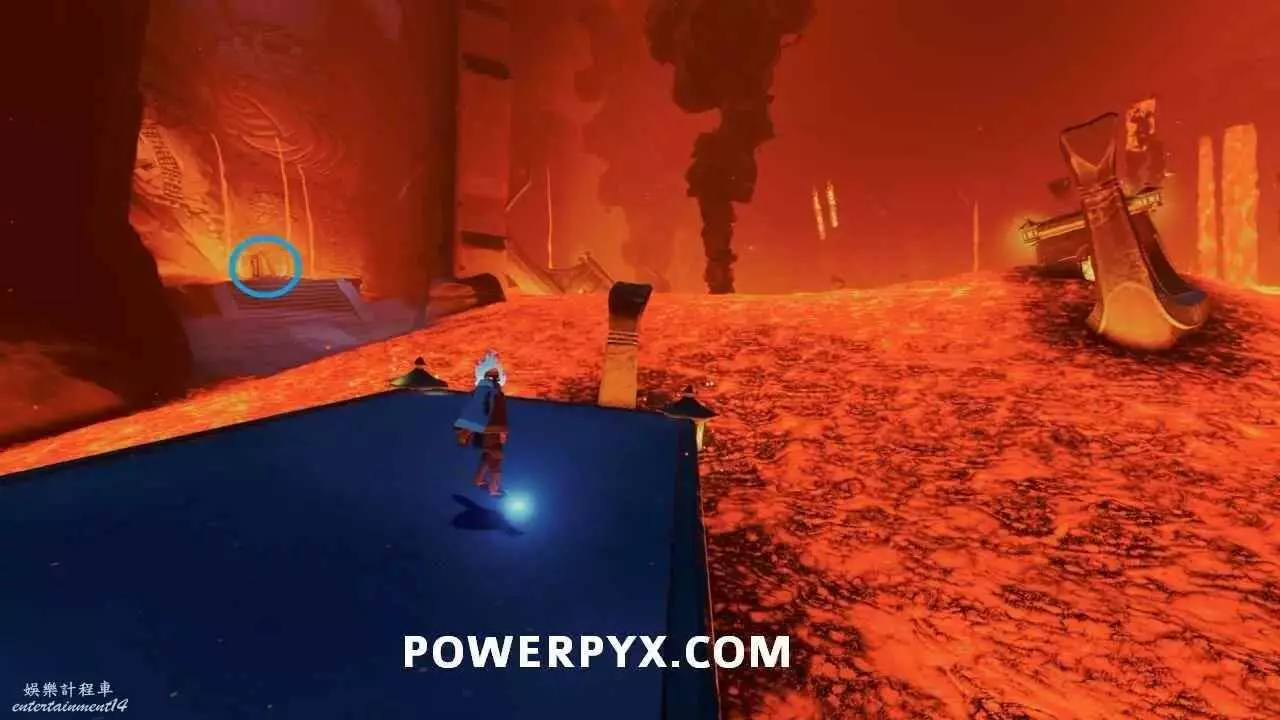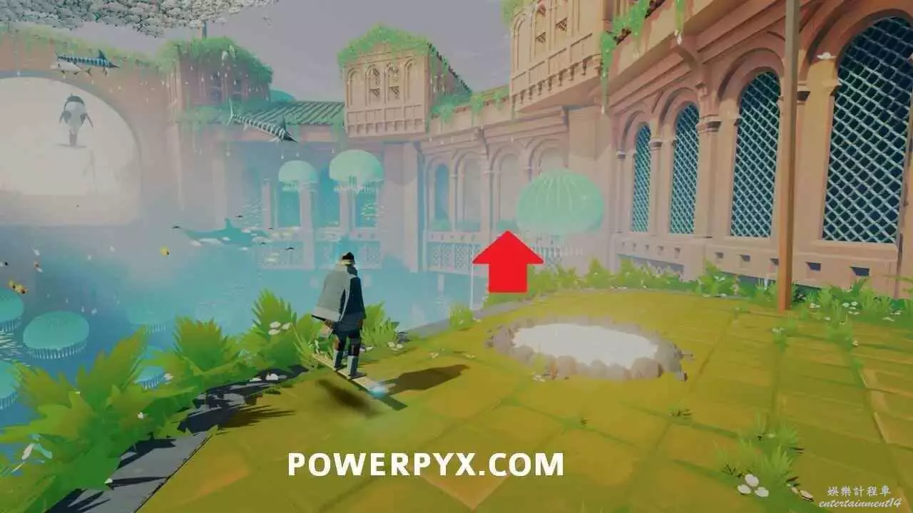 啟動浮島上的出水點以開啟通往關卡出口的橋的最後一部分之後,使用中間建築中層的水母跳到其中一個小島上,即可在頂部看到石板。