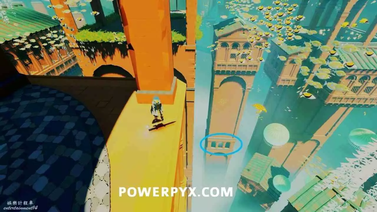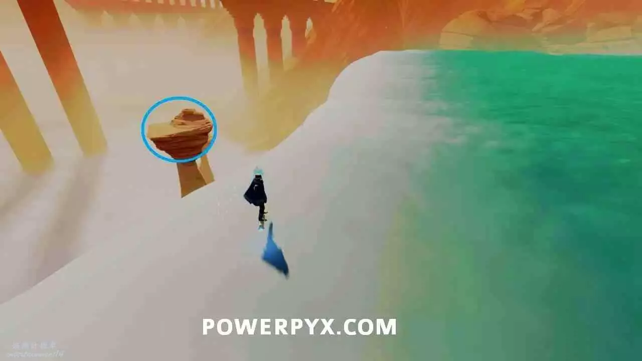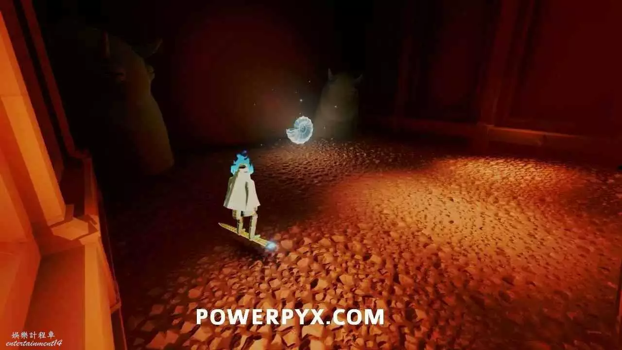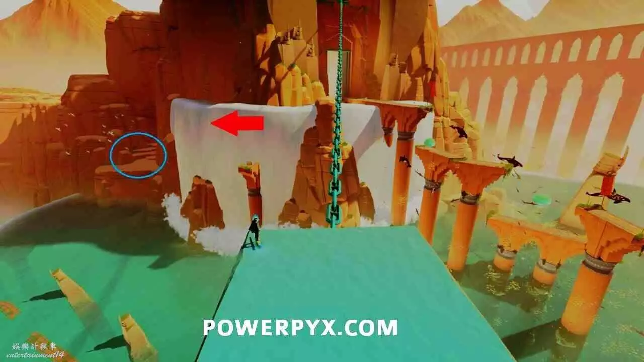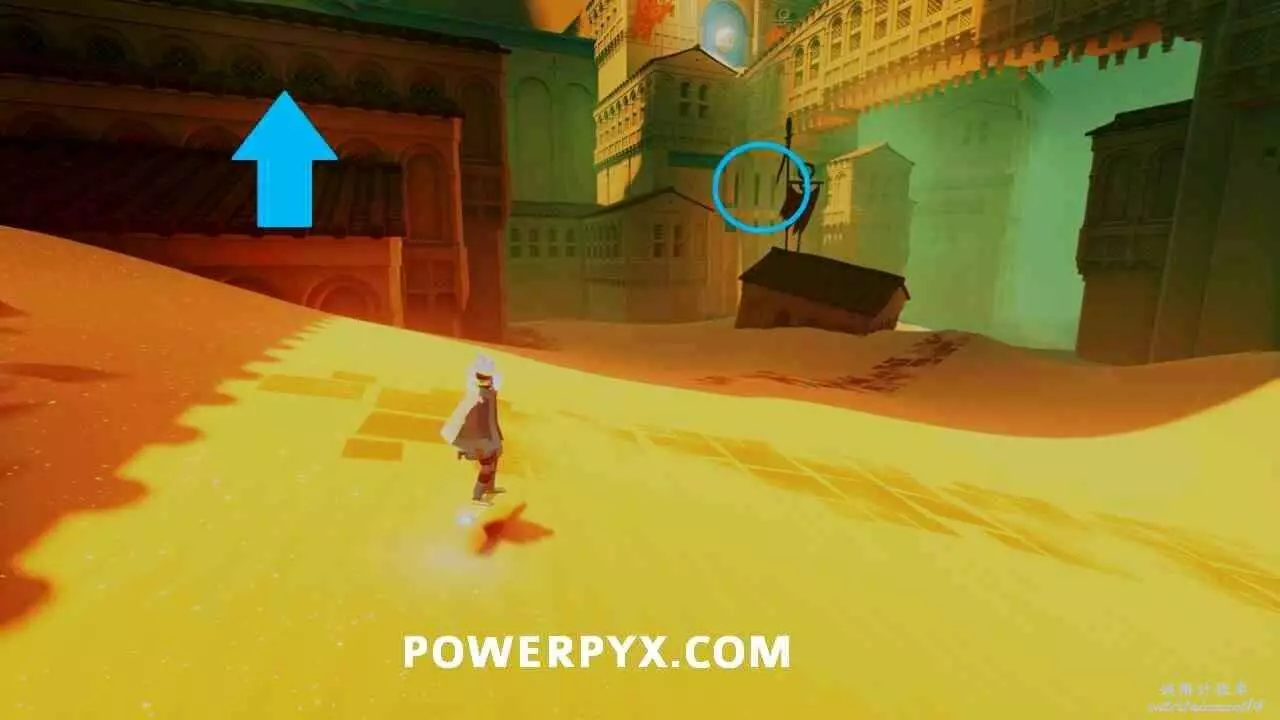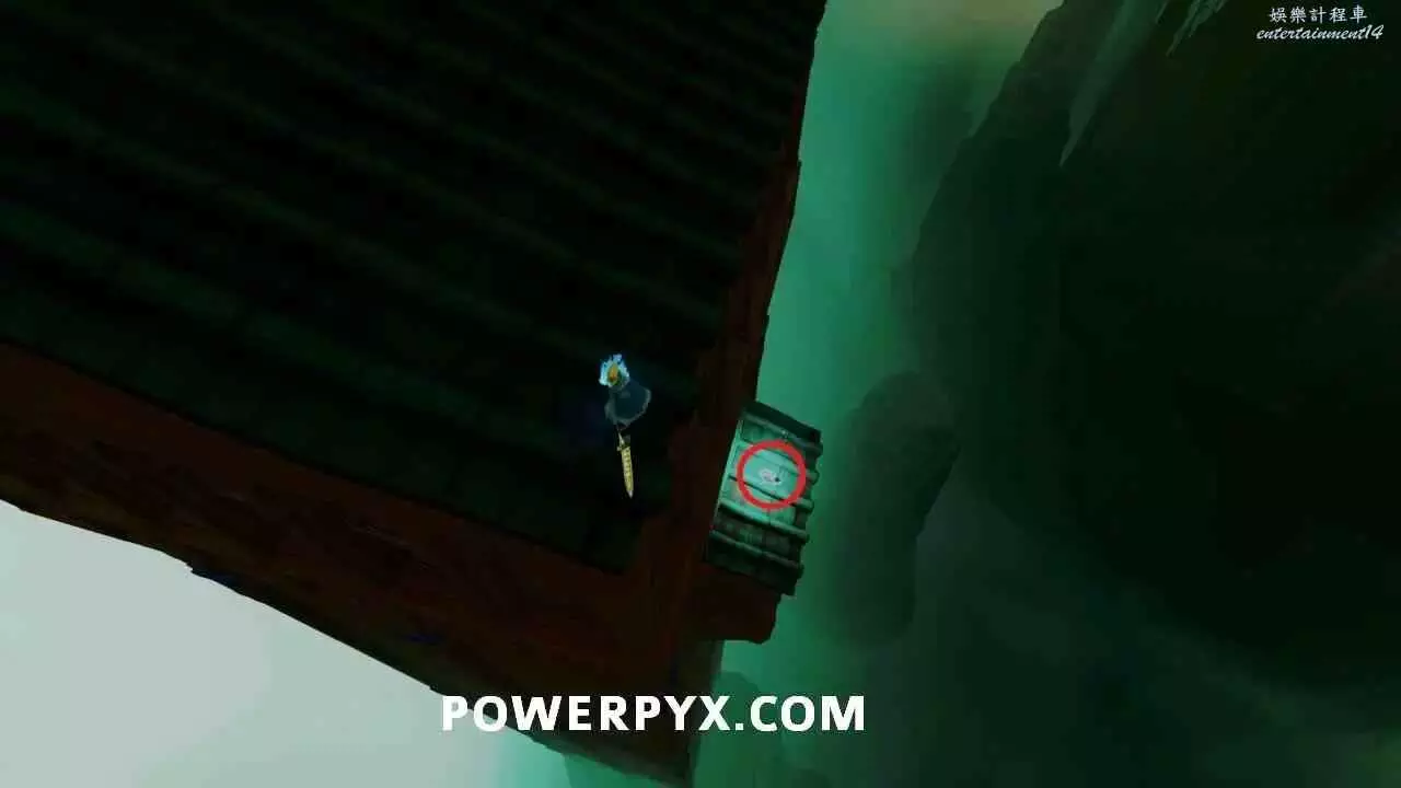 在兩隻烏龜腦袋所在區域,沿路網上爬到石板上方的屋頂,跳到沙瀑後面的窗戶即可看到貝殼。