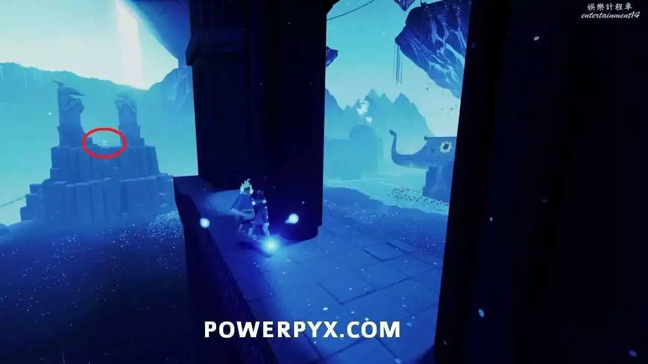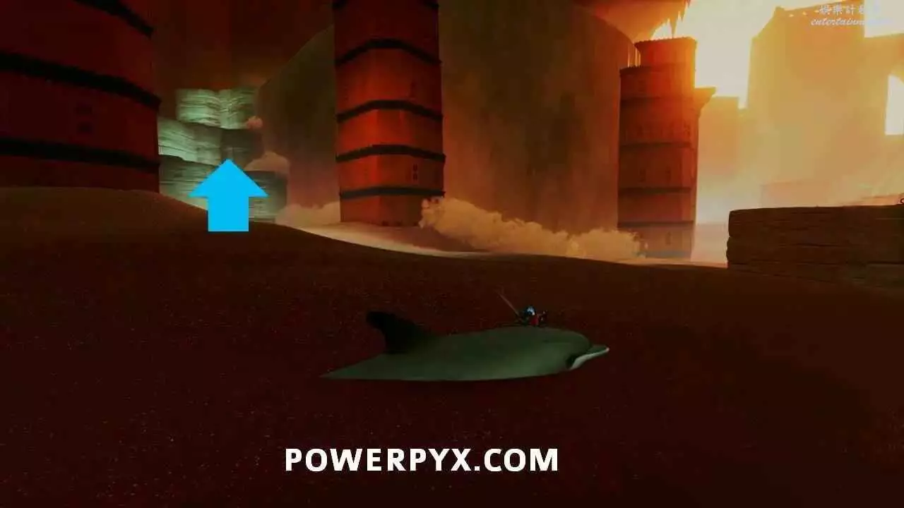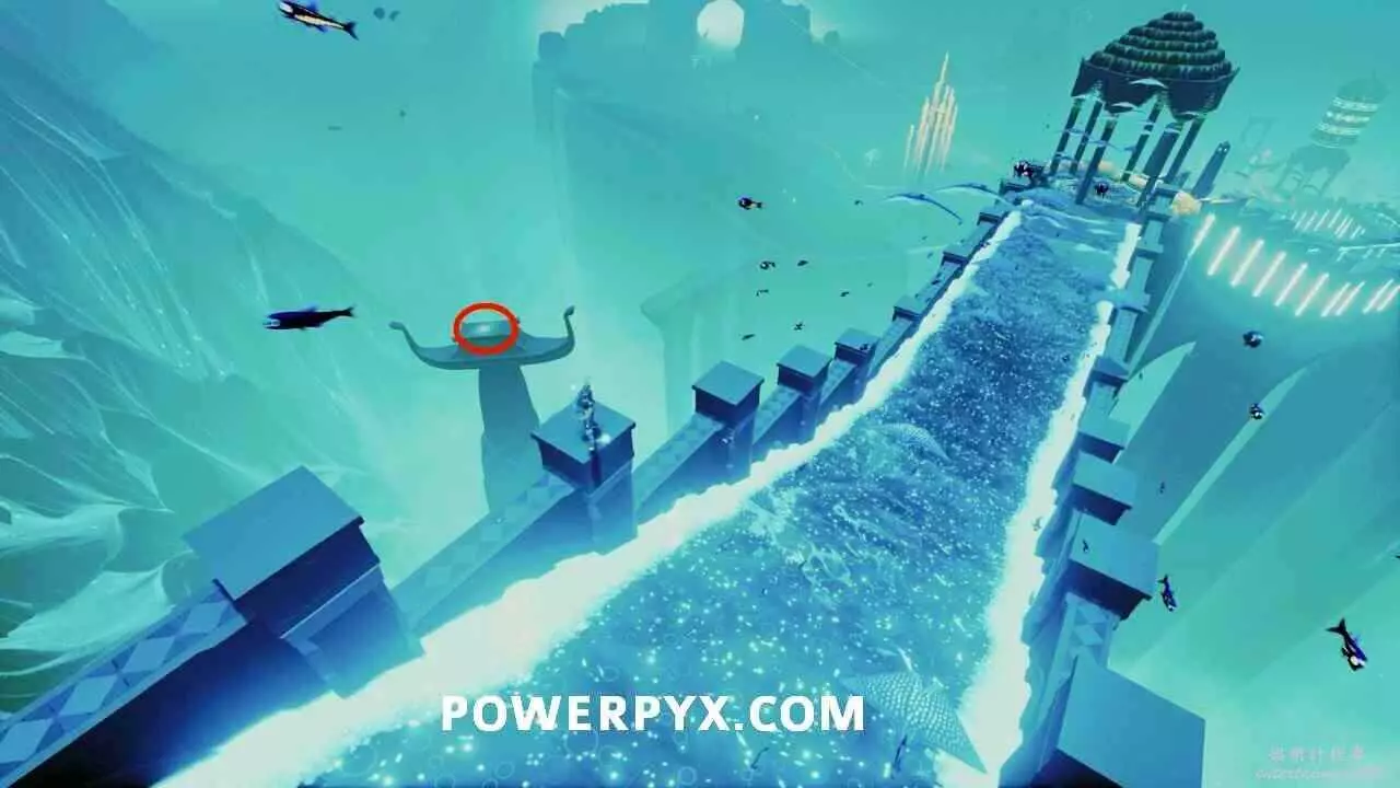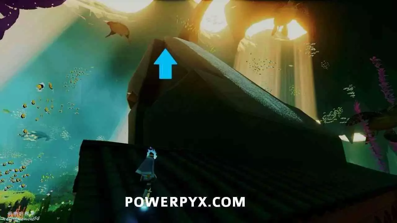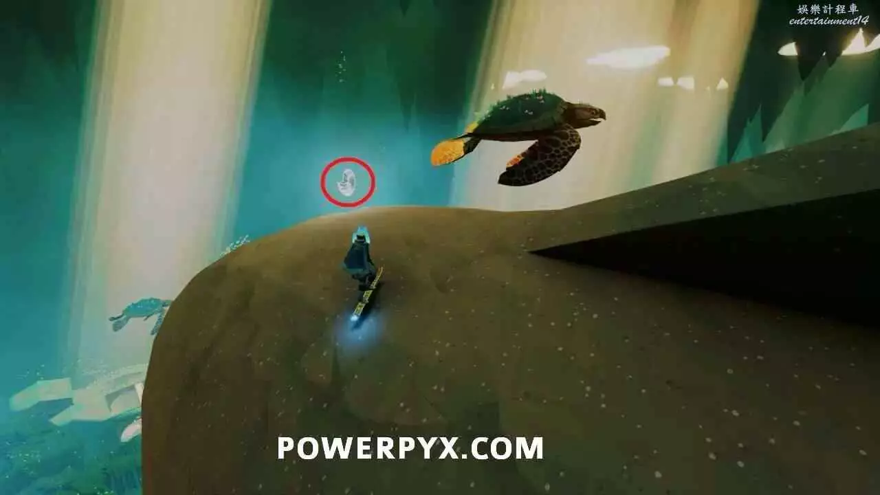 在下一個需要通過發光石柱獲取加速能量的區域,收集能量後前往區域頂端,往回看入口鯊魚雕像左側,利用水母跳到遠方平台,搭配使用加速跳躍到達有寶箱的近處平台,再次加速跳到入口附近的兩個平台上,在較遠的平台盡頭可以看到貝殼。