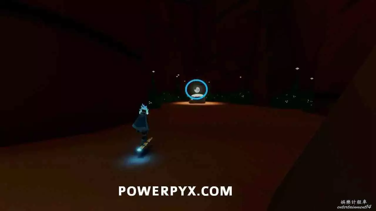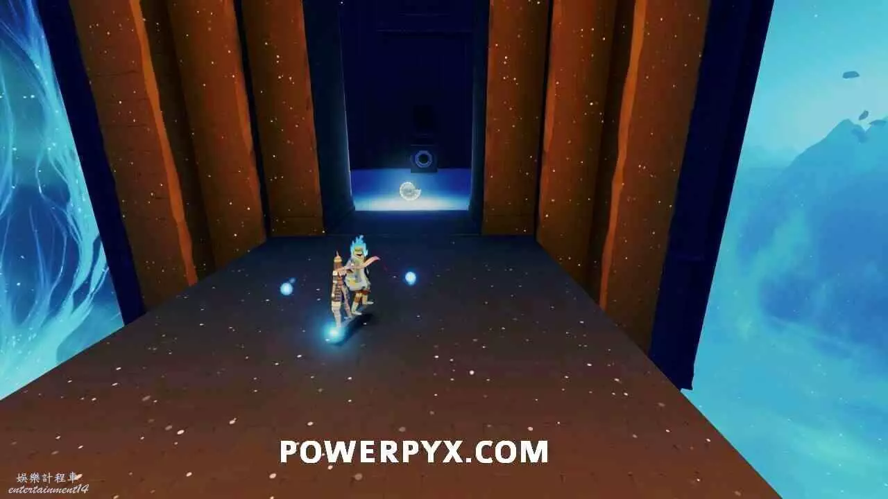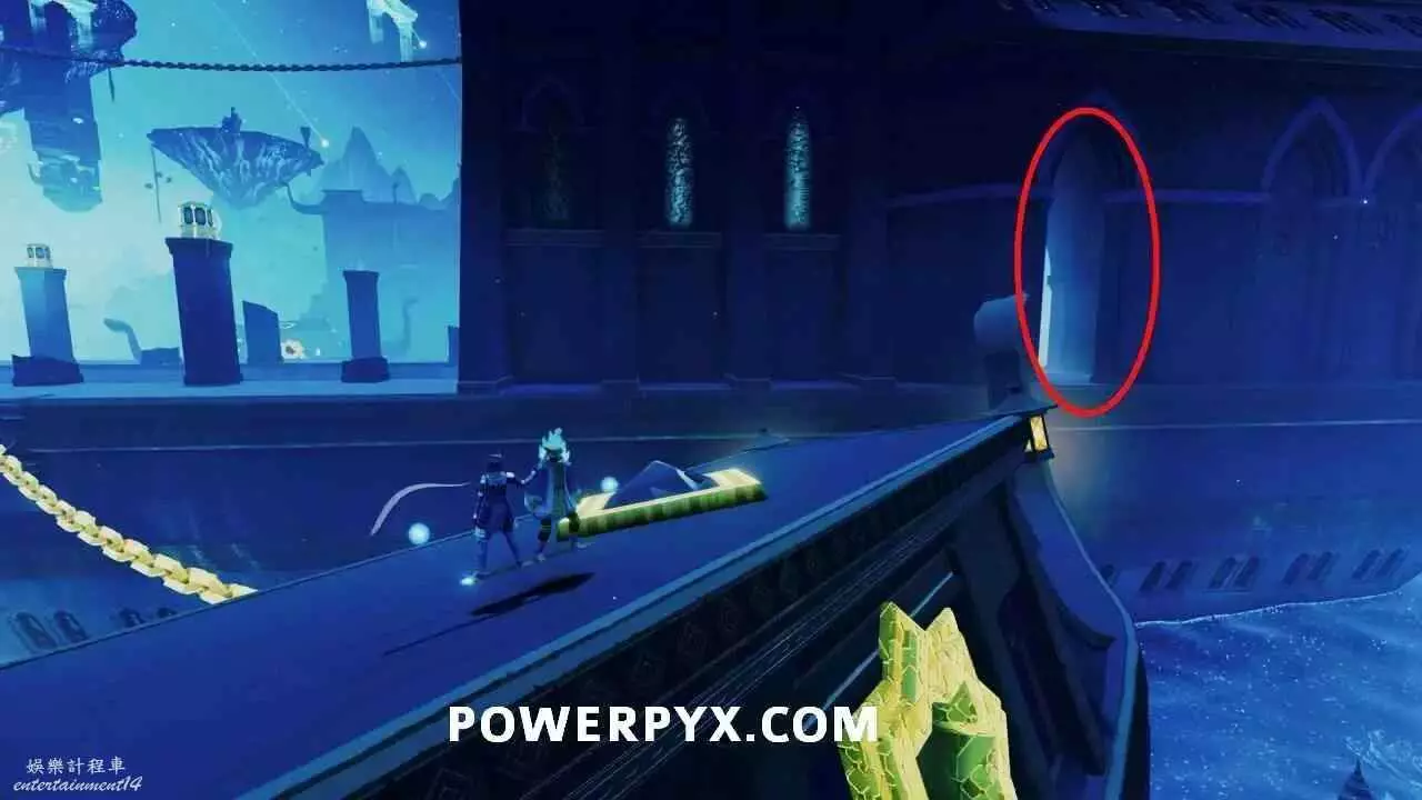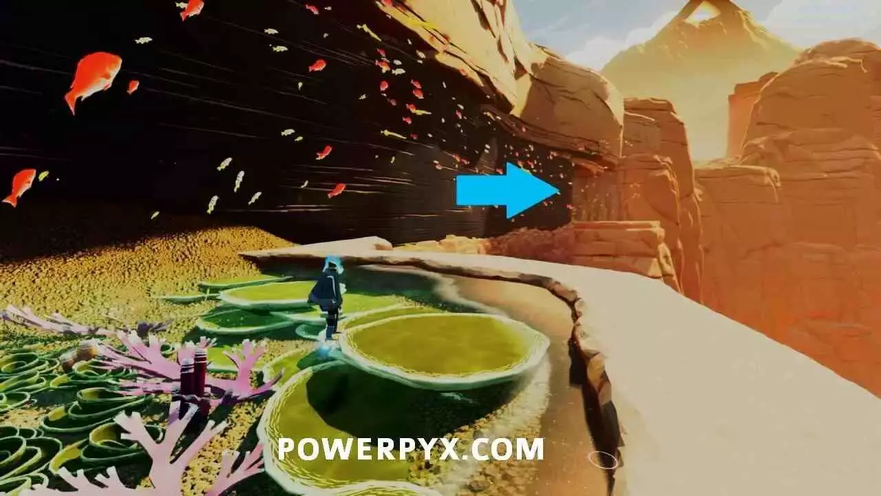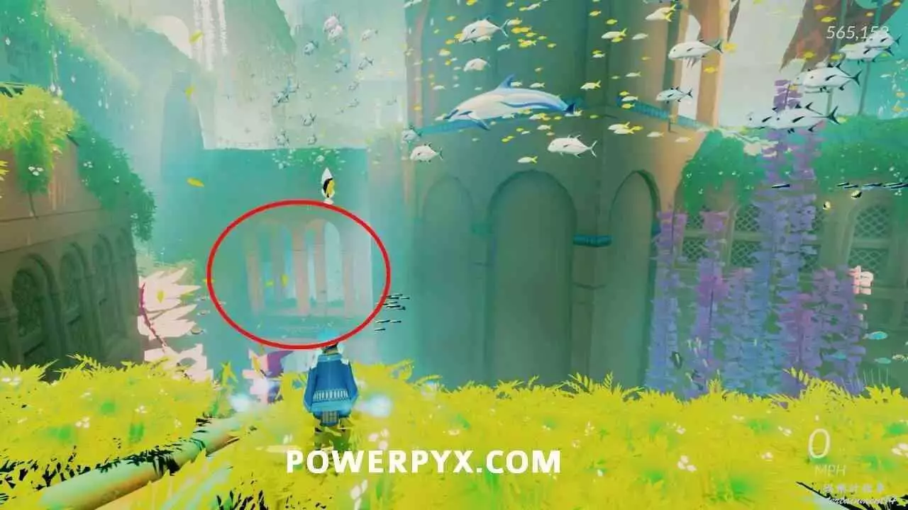 在下一個需要通過發光石柱獲取加速能量的區域,收集能量後前往區域頂端,往回看入口鯊魚雕像左側,利用水母跳到遠方平台,搭配使用加速跳躍到達有寶箱的近處平台,再次加速跳到入口附近的兩個平台上,在較遠的平台盡頭可以看到貝殼。