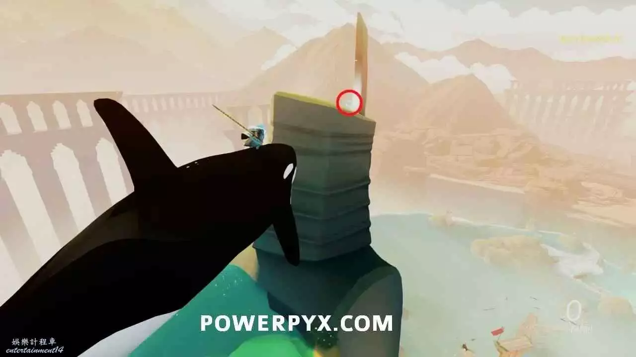 在巨大的圓形房間啟動水源點後,騎抹香鯨來到房間頂端,貝殼就在入口上方的環形平台上。