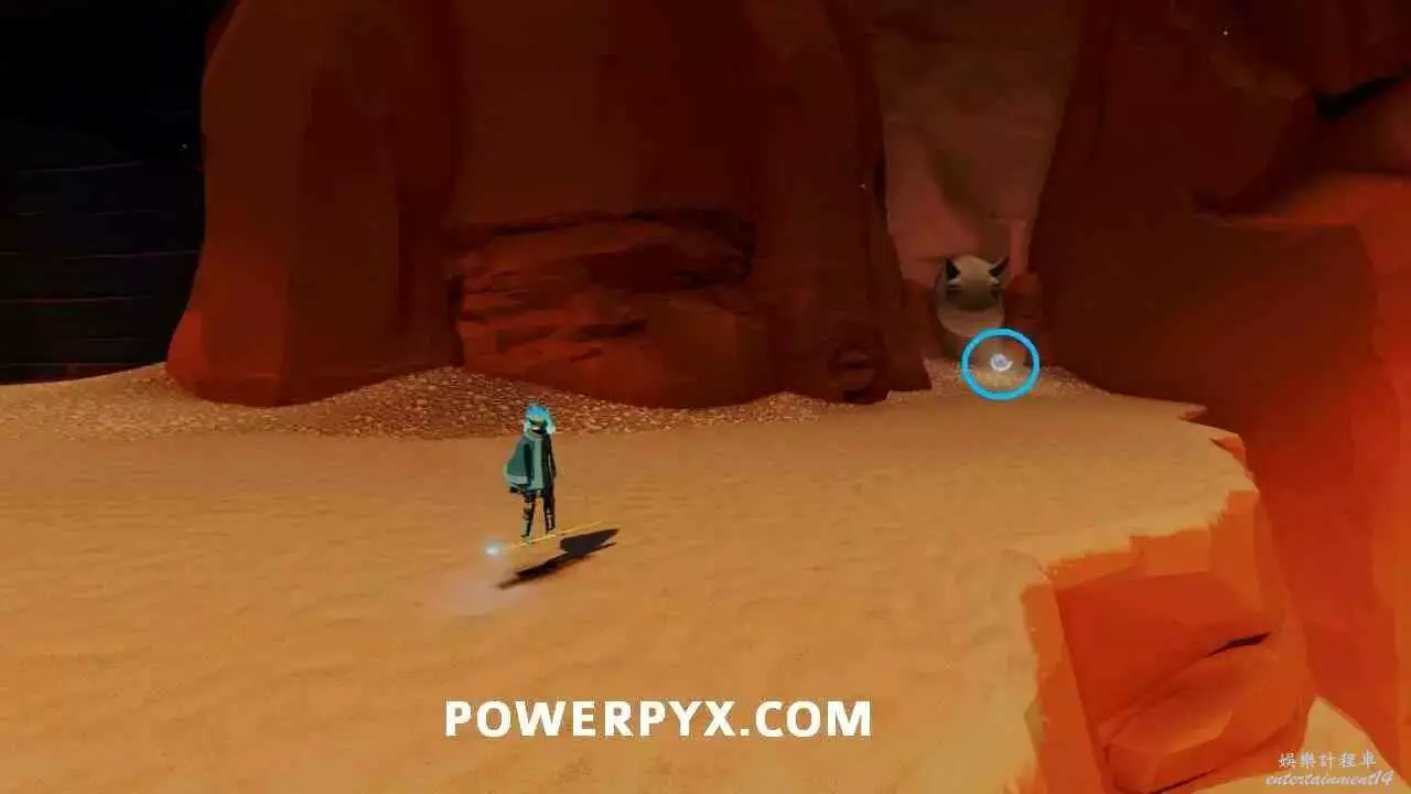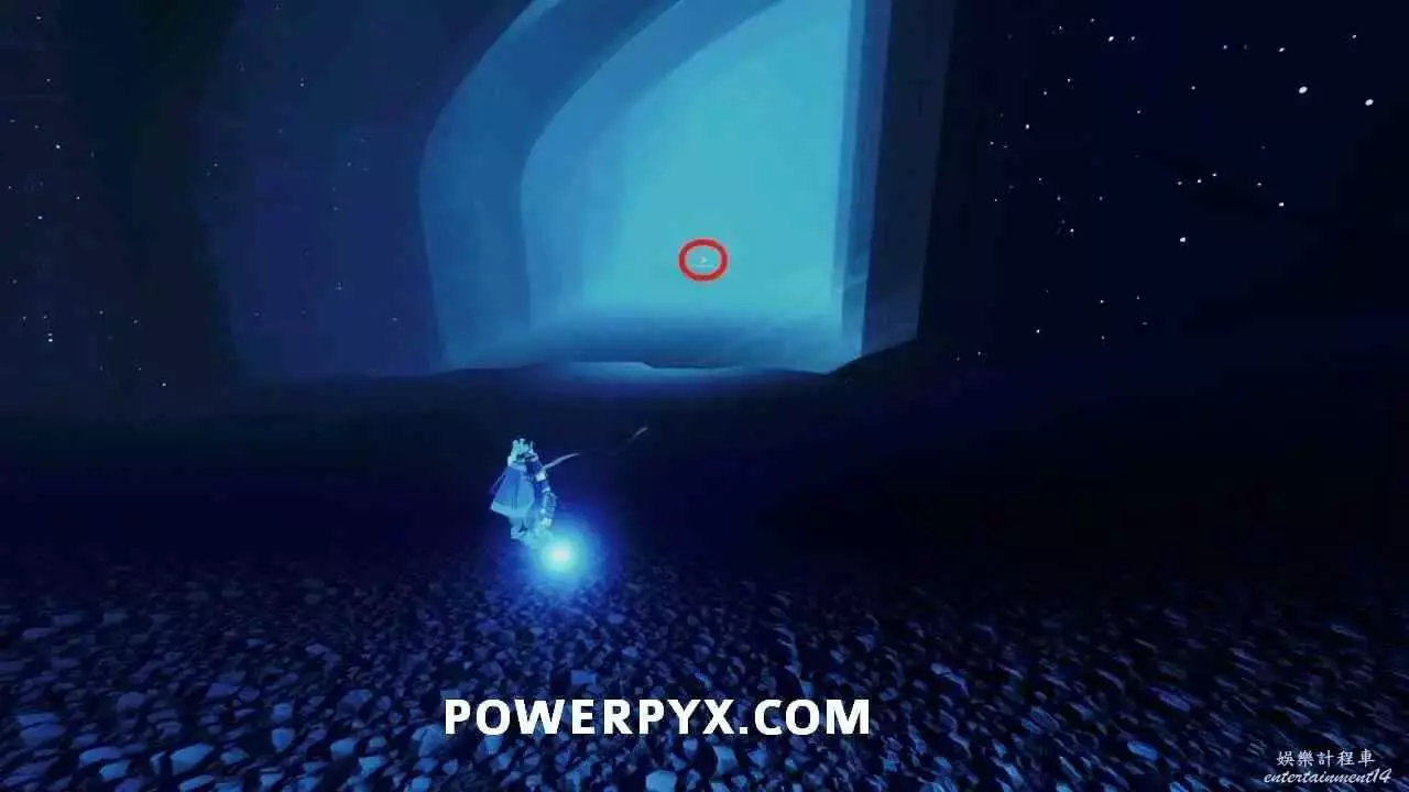 位於開闊區域緊貼左側牆壁斜坡處的燈籠堆。點亮燈籠後進入洞內,啟動第二撮燈籠排空洞內沙子。沿左側通道走到水源點,可以看到石碑右側有個洞穴入口。利用洞內水母跳起左轉沿路到達下一個水源點,啟動水流後從左側貼牆走到盡頭平台即可看到貝殼。
