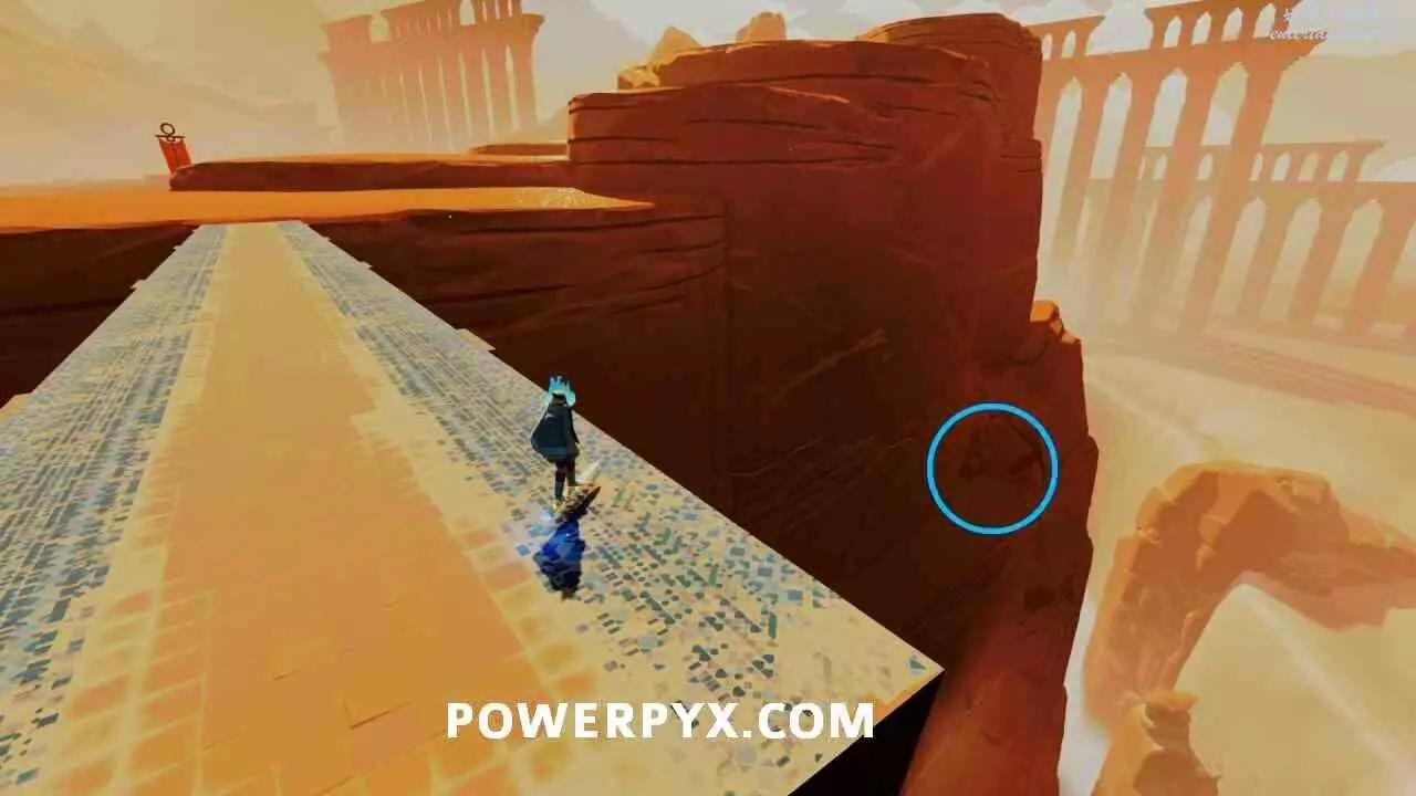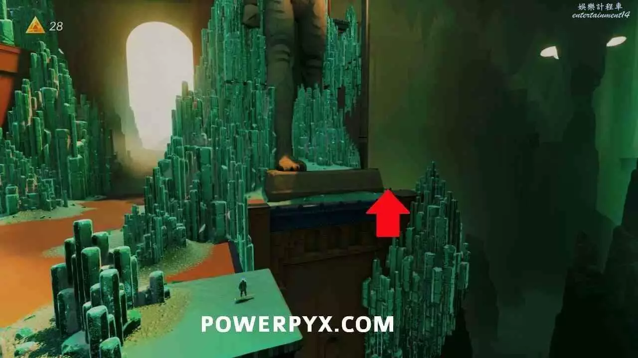 位於需要啟動兩個金鐘開啟出口的開闊地帶,前往左側金鐘所在的大平台,繞到鯊魚雕像胸部石板後方,沿著雕像左臂跳到後方即可在平台上看見貝殼。
