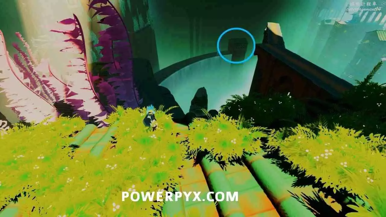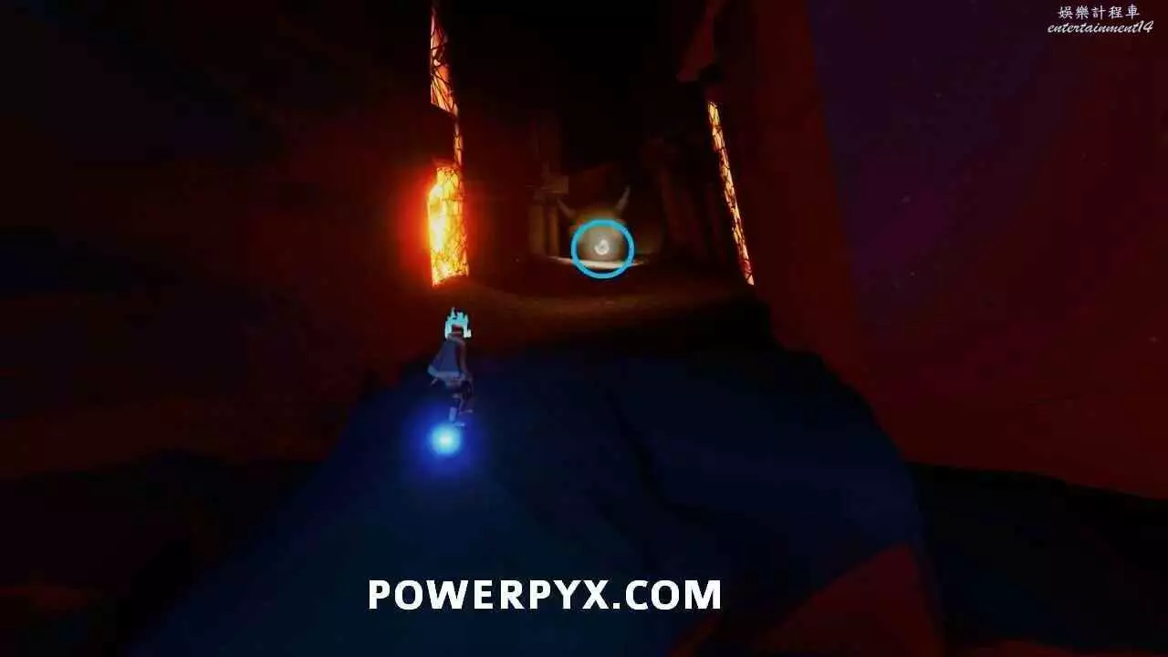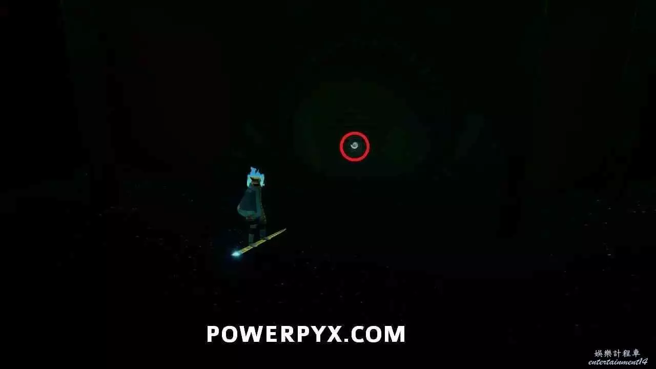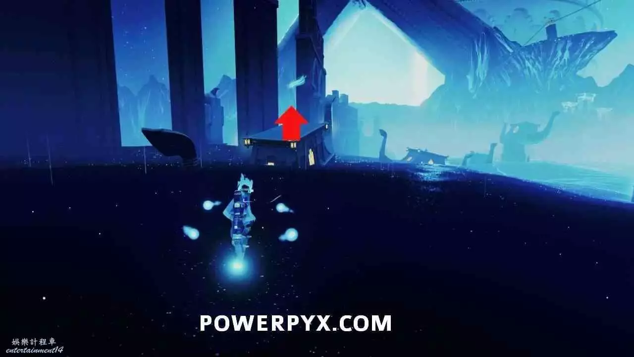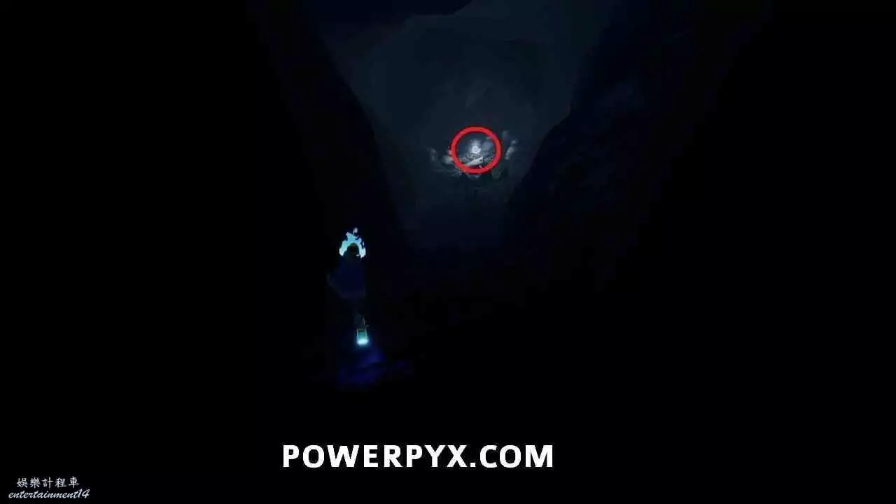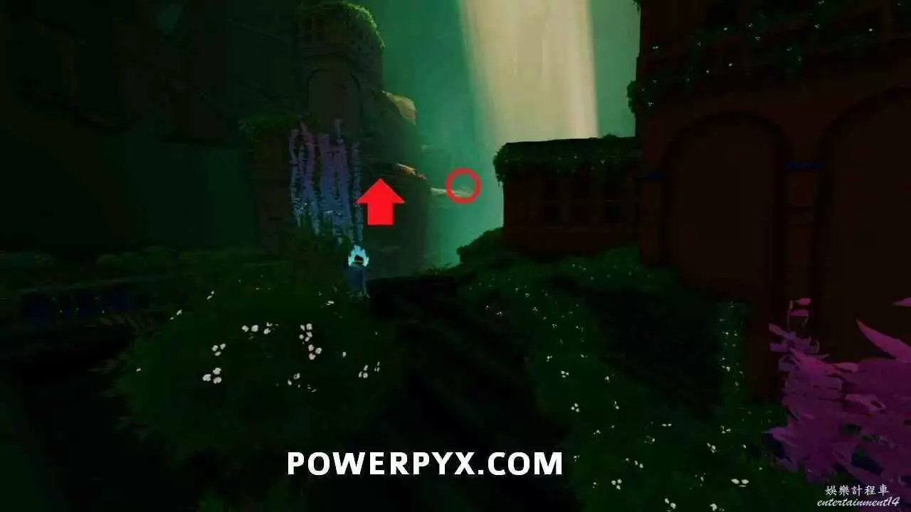 從上一個跳躍點左側的水母跳到遠處的門廊,進入區域後沿著骨頭走到水源點,貝殼就在水源點正上方的頭骨內。