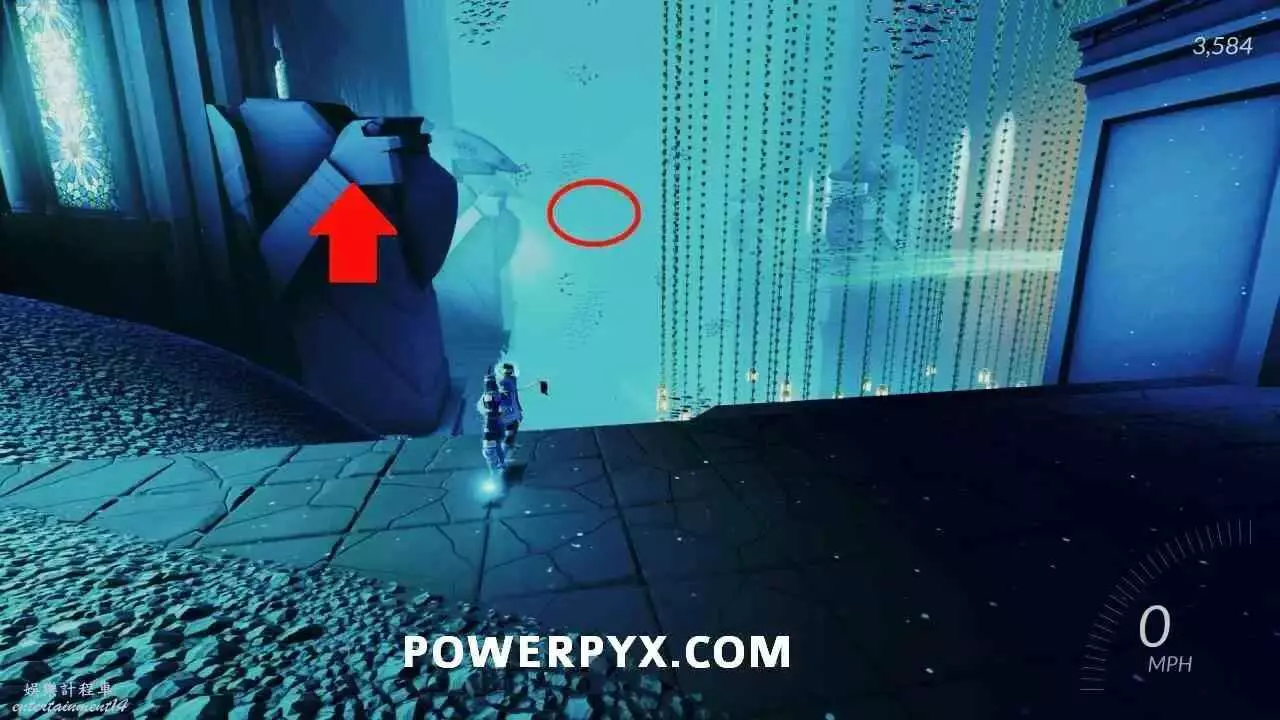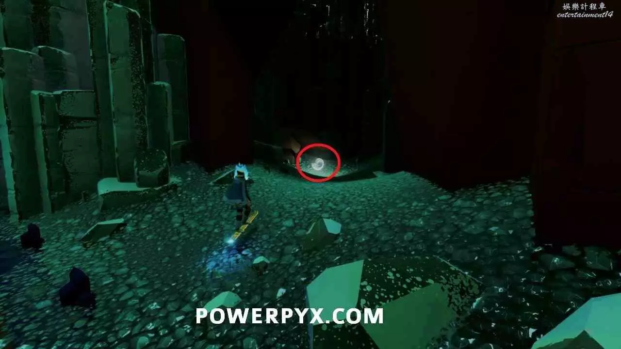 開啟第一扇水泡門後,跳到右側石板後方的岩石,順時針沿著環繞房間的路往前走,跳到遠處的平台頂端即可看到貝殼。