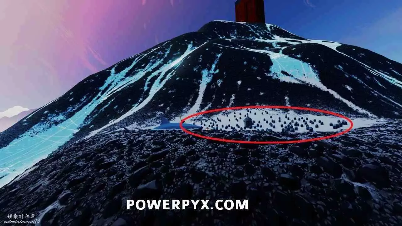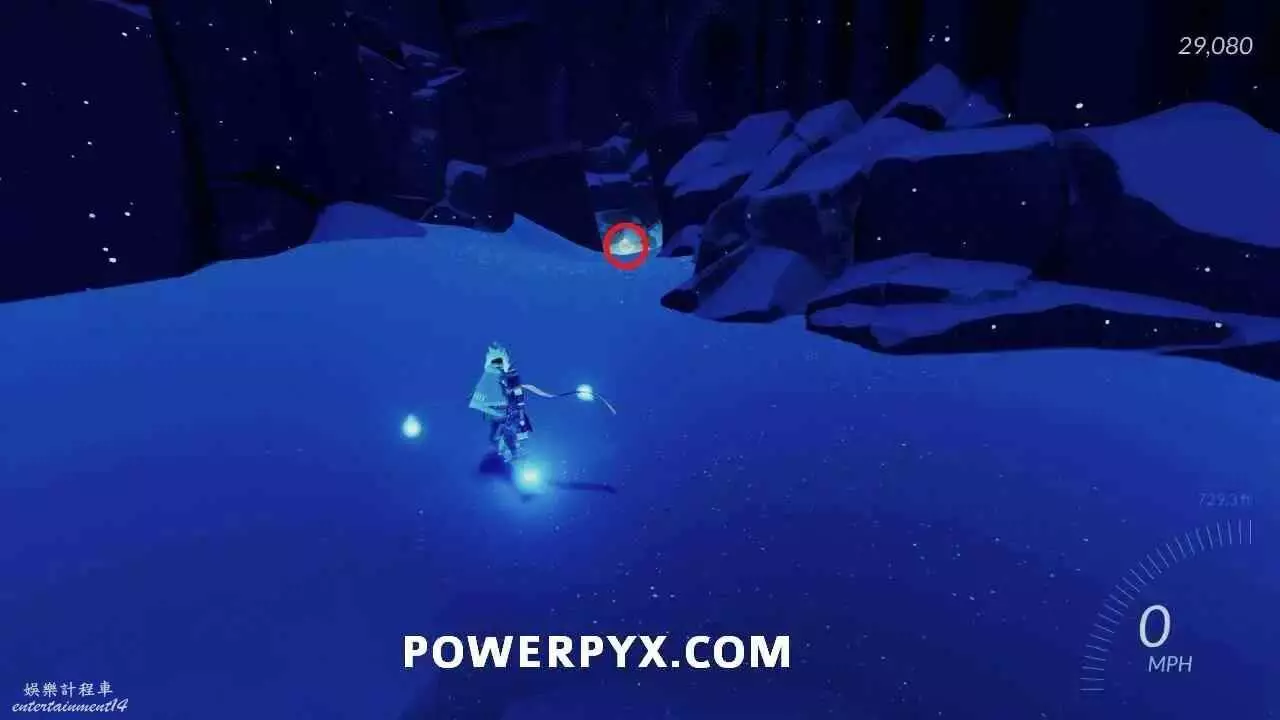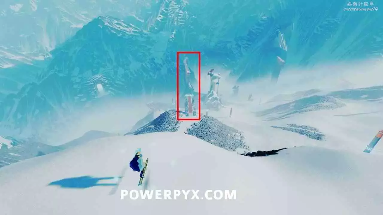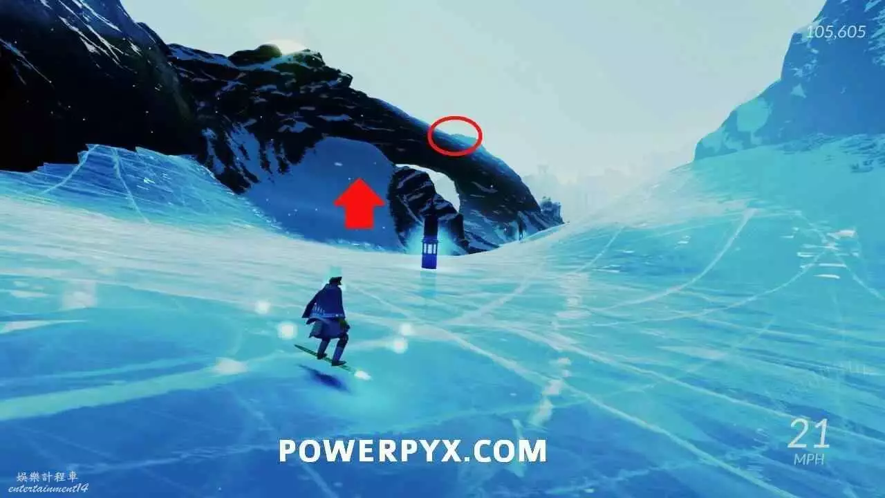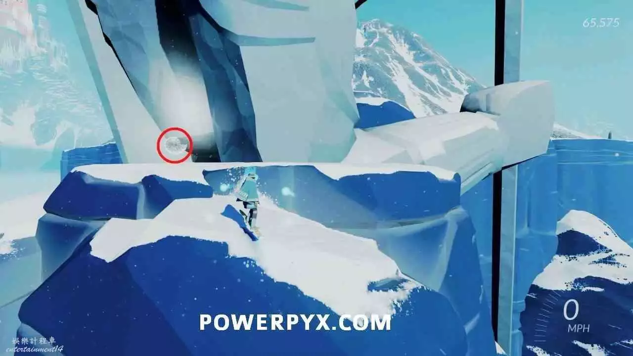 在同一個位置往回看拱形石頭,從左側雪坡加速跳到拱形石頭頂部即可看到貝殼。