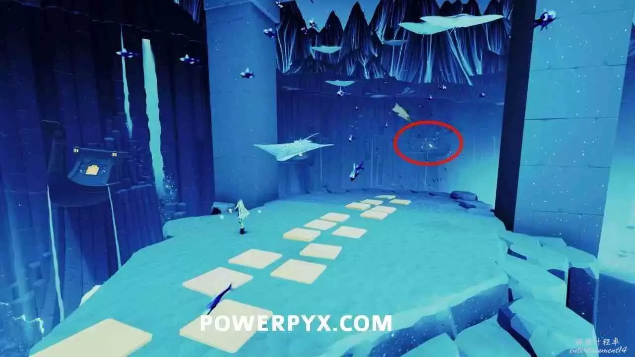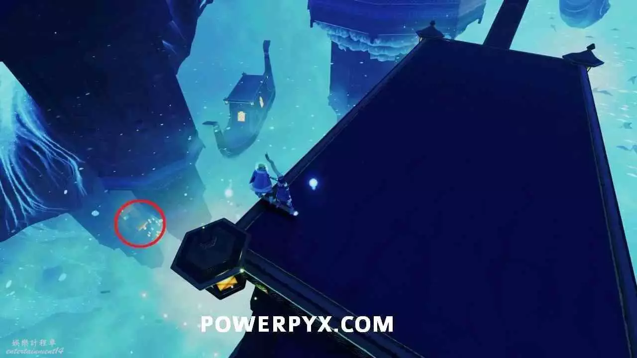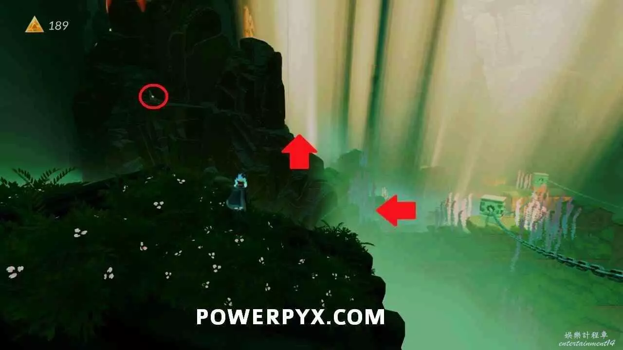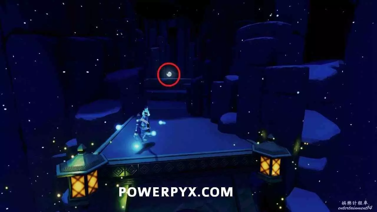 在有三枚水晶石的區域,從第一個水晶石之後爬上二層平台,繞過啟動下一個晶體的燈籠堆,先沿路右轉爬到岩壁上,在頂端的綠色晶體中有一個燈籠堆,點亮之後會出現水母,利用水母跳到遠處的石柱上即可看到貝殼。