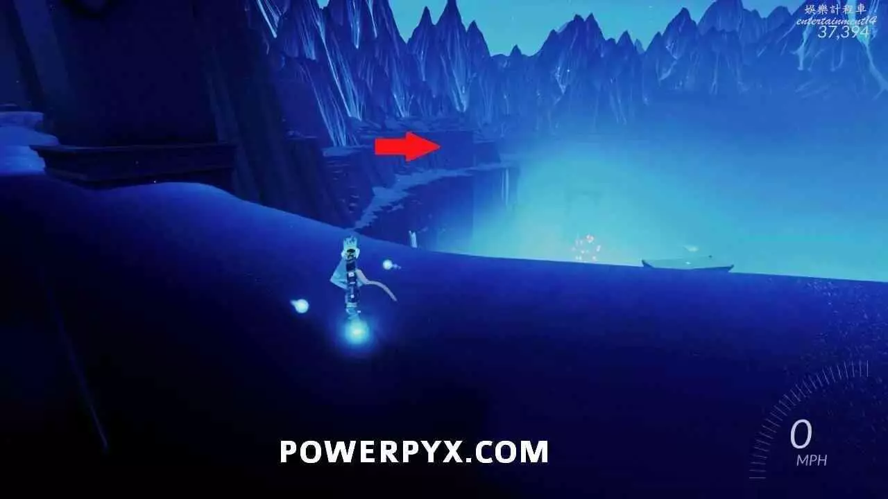 在巨大船隻出水的區域,靠近岩壁後方可以看到帶有軌道提示的一艘船,從船上加速起跳,沿著軌道往高塔方向走,來到牆體末段,再次加速起跳並滑到上方區域即可看到貝殼。