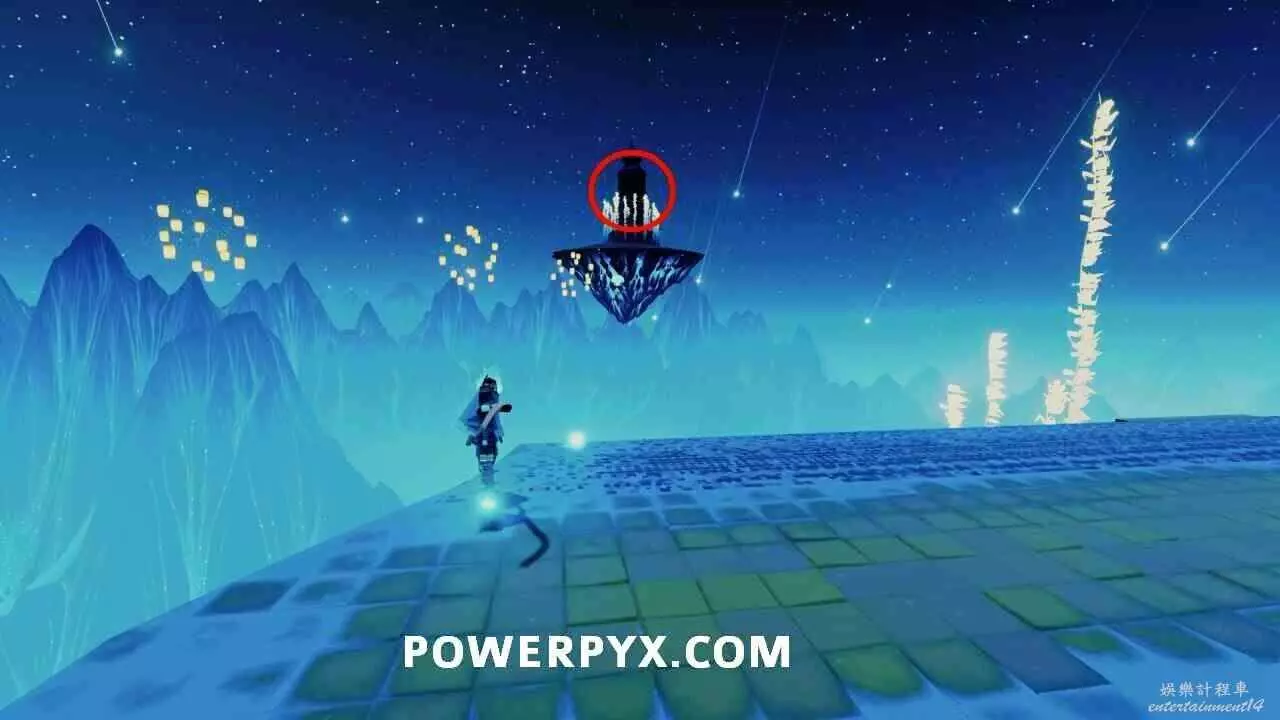 在巨型浮島下方,往左下方看可以看到洞口的燈籠堆,利用低處的船跳到洞口即可看到貝殼。