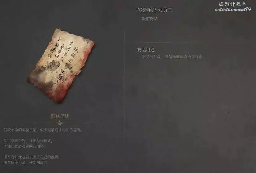 (2)普元寺神龕後面,之前見到垂髫小童的地方,見到方瑤,會聽到方瑤在哭,可以對話2次。對話後,獲得貴重物品【實驗手記·殘頁三】、【輪回之環·因】。