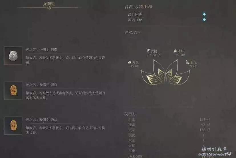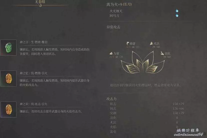 推薦用“離為火”火附魔砍,傷害十分可觀;玉佩帶上【蹬龍玉佩】和【降妖玉佩】;法術必帶【縹緲決】,應對P2階段可以用【天威雷罰】輸出。