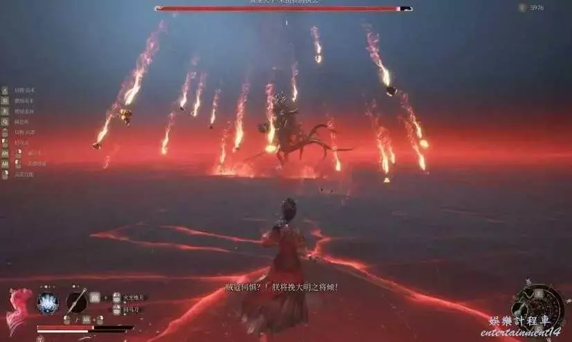 真龍天子單手朝天,喊話“賊寇何懼……”,同時以金色氣息彙聚一個球體,持續恢復自身血量(大概是5%-10%的幅度),喊話結束後,球體爆裂形成大量火流星墜地。