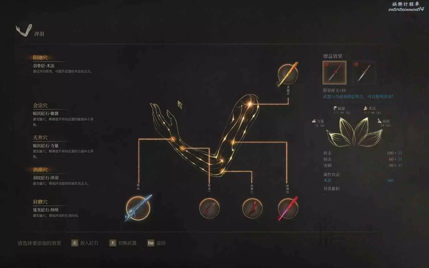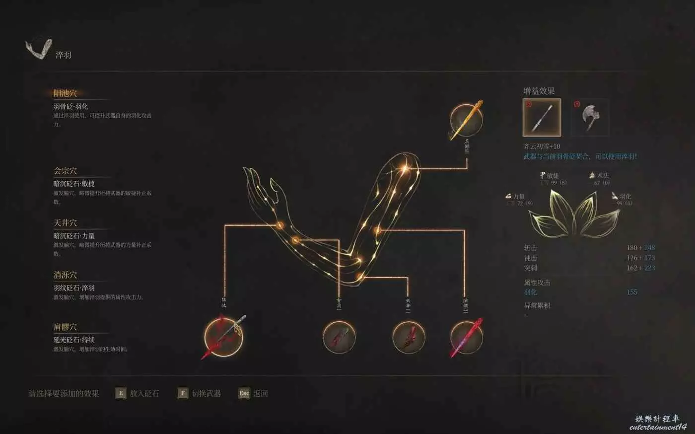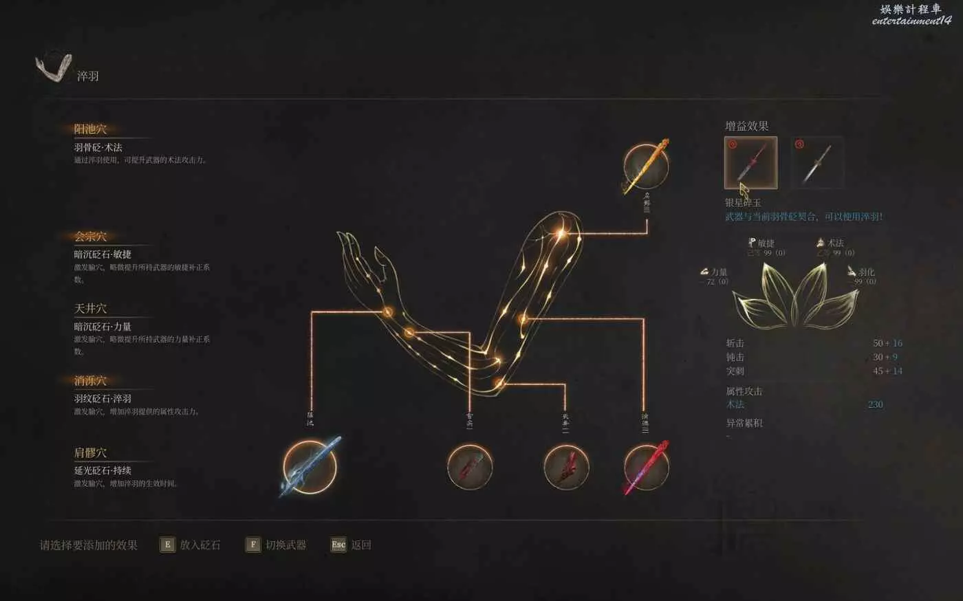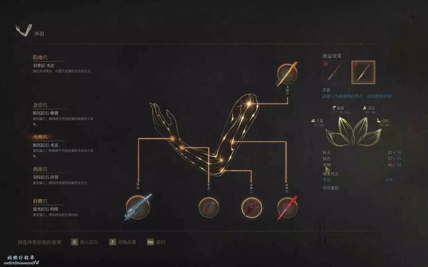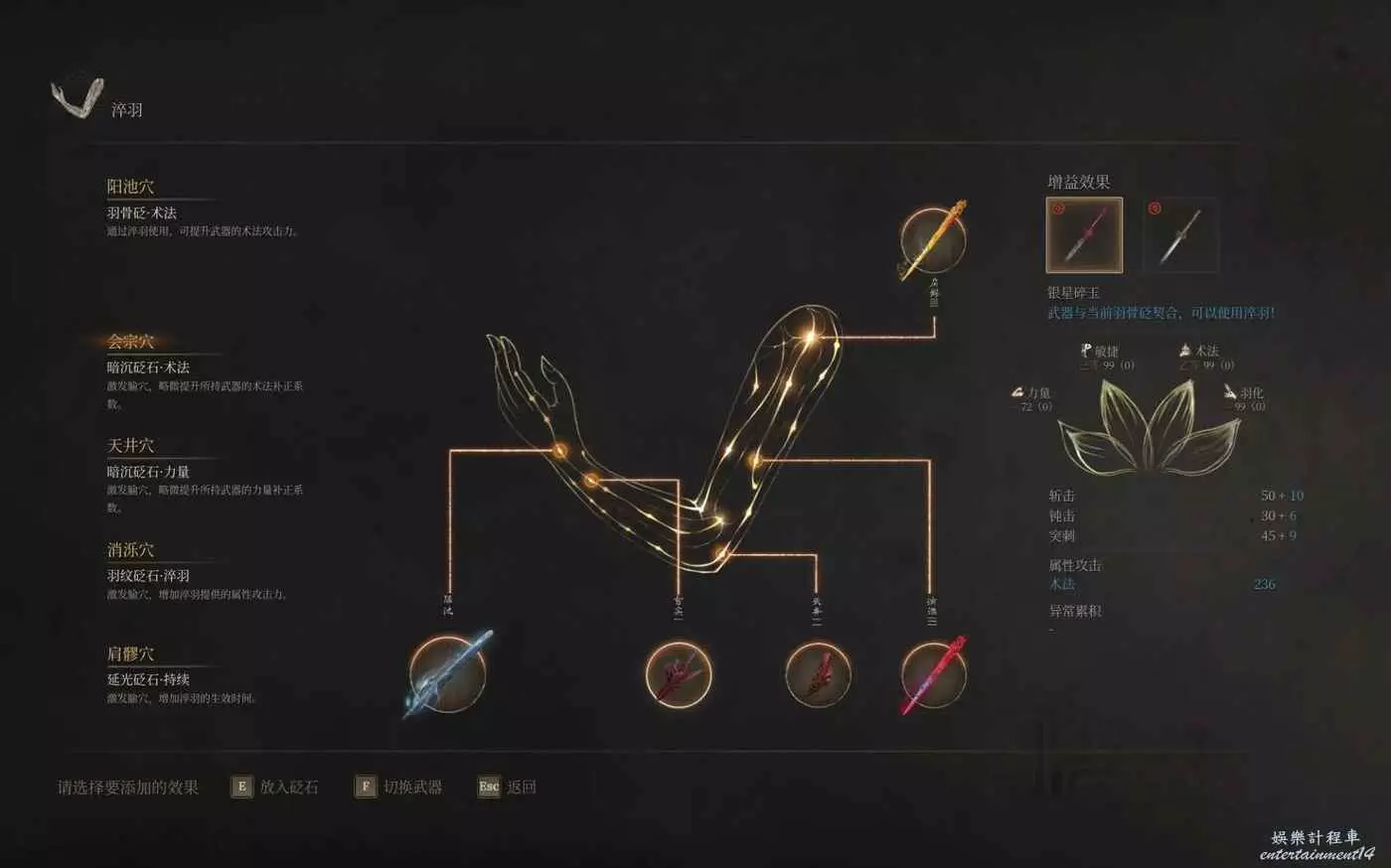 若武器本身有術法/羽化補正,則對應淬羽帶來的屬性傷害會額外再吃一份補正,再裝上對應的砭石,淬羽也可以吃到砭石帶來的補正提升。
