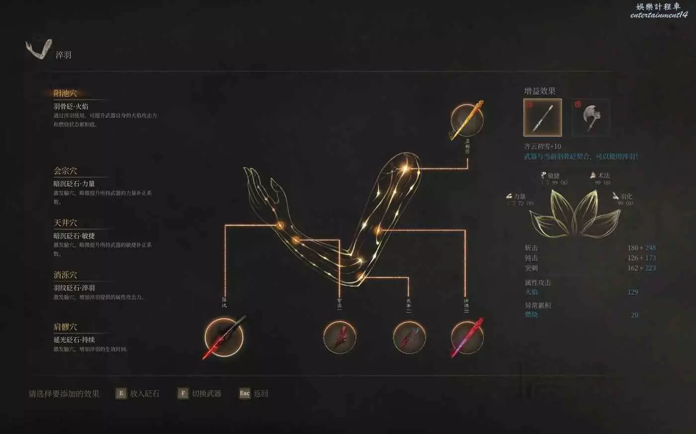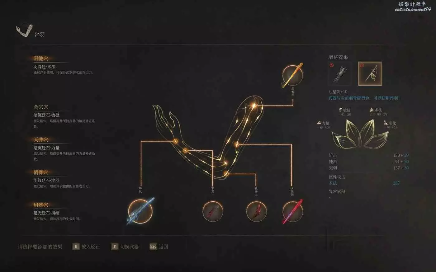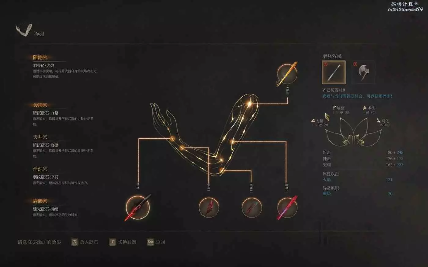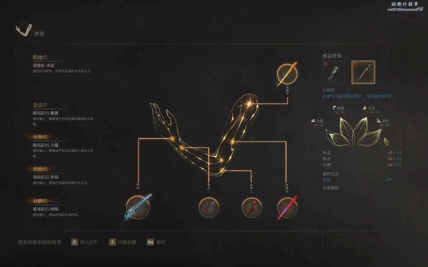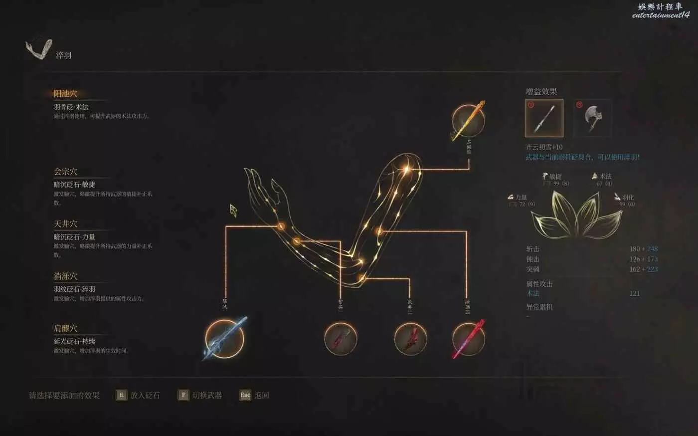 若武器本身有術法/羽化補正,則對應淬羽帶來的屬性傷害會額外再吃一份補正,再裝上對應的砭石,淬羽也可以吃到砭石帶來的補正提升。