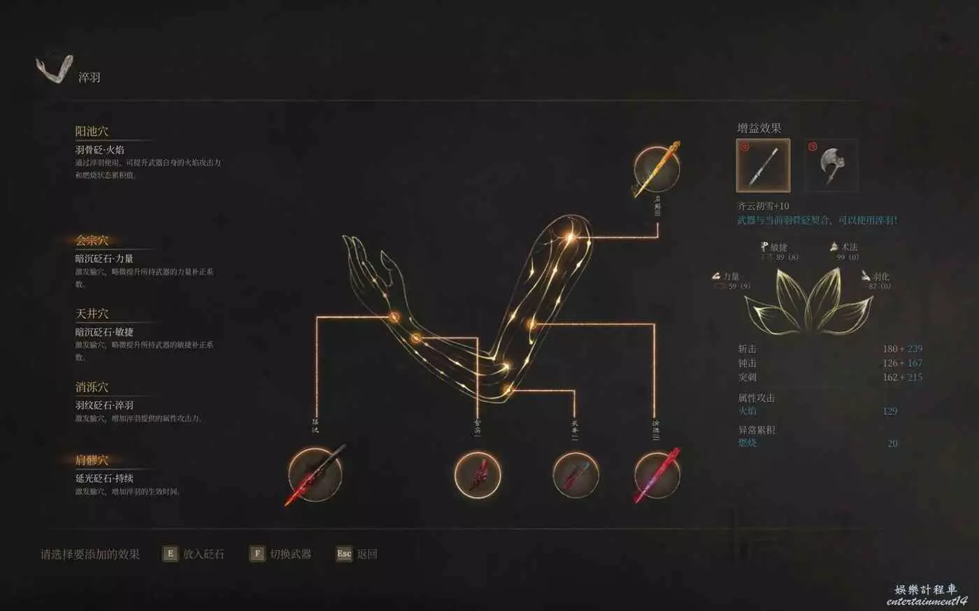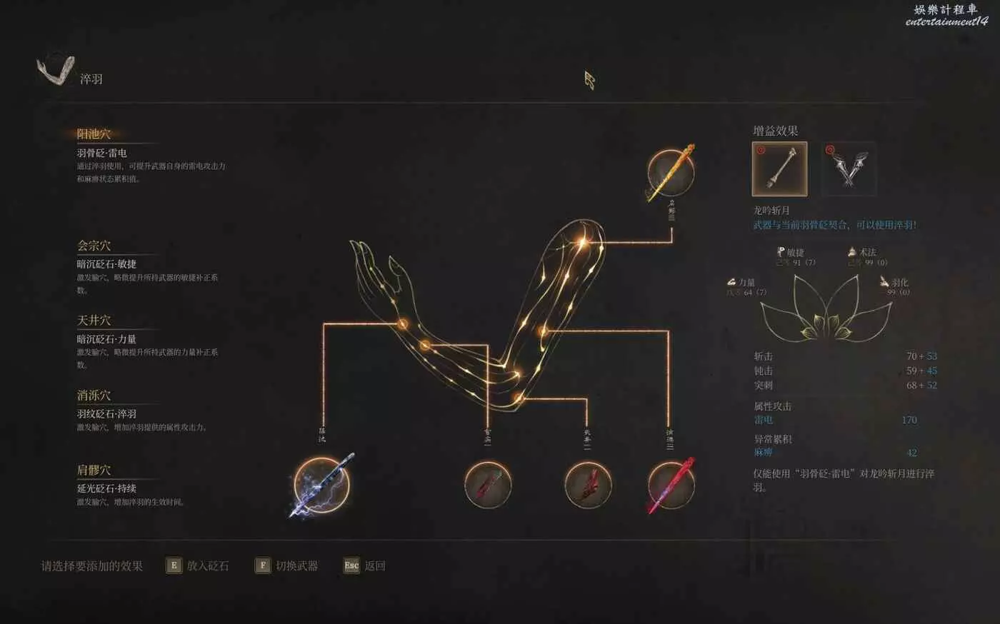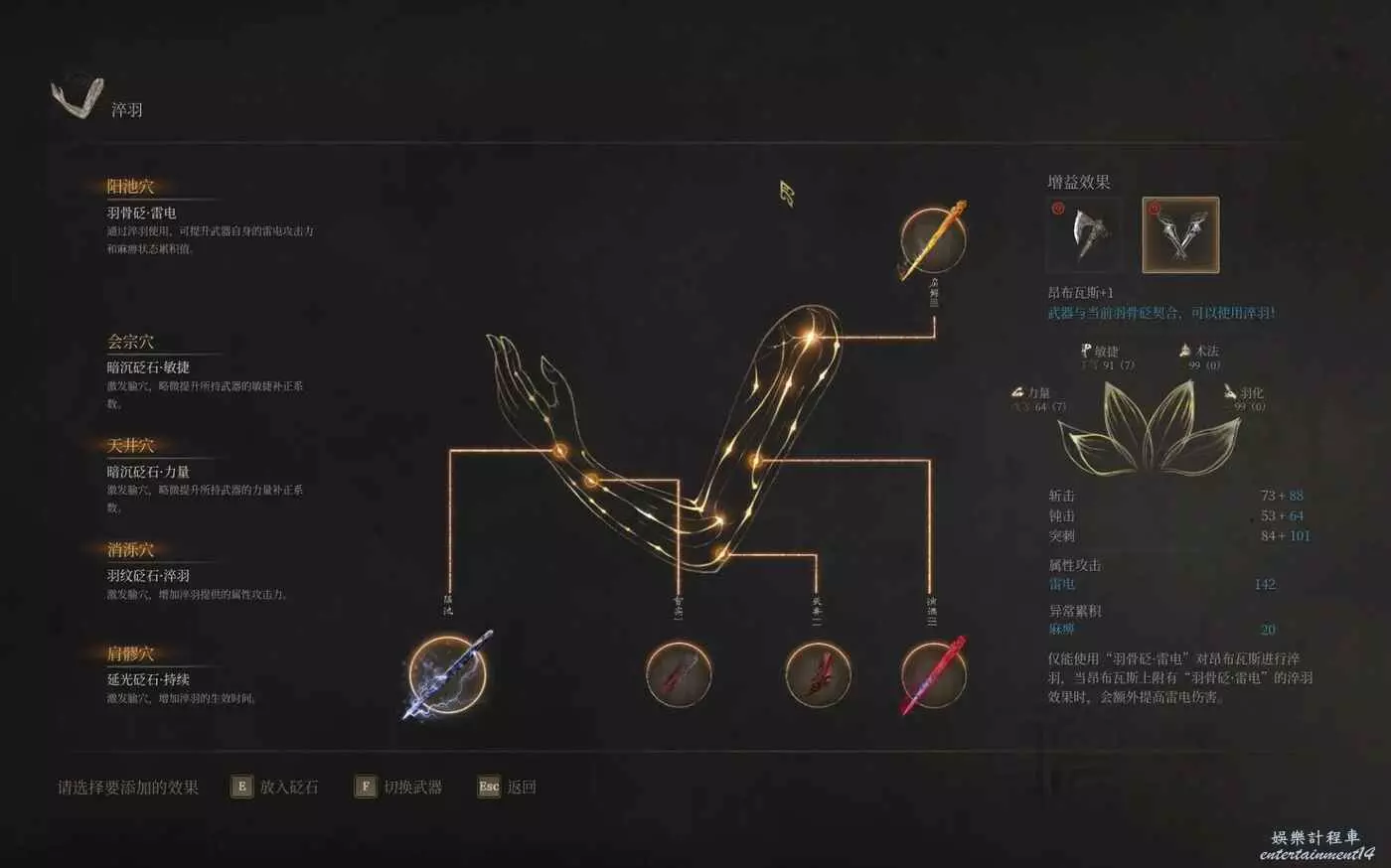 雷電、火焰、術法、羽化四種淬羽會增加傷害,其中火焰、雷電附帶的異常值機制與上文一致。