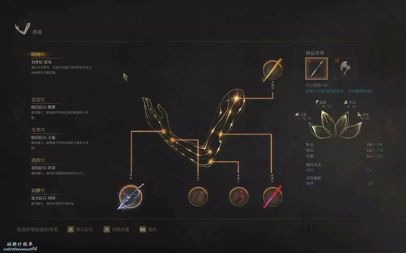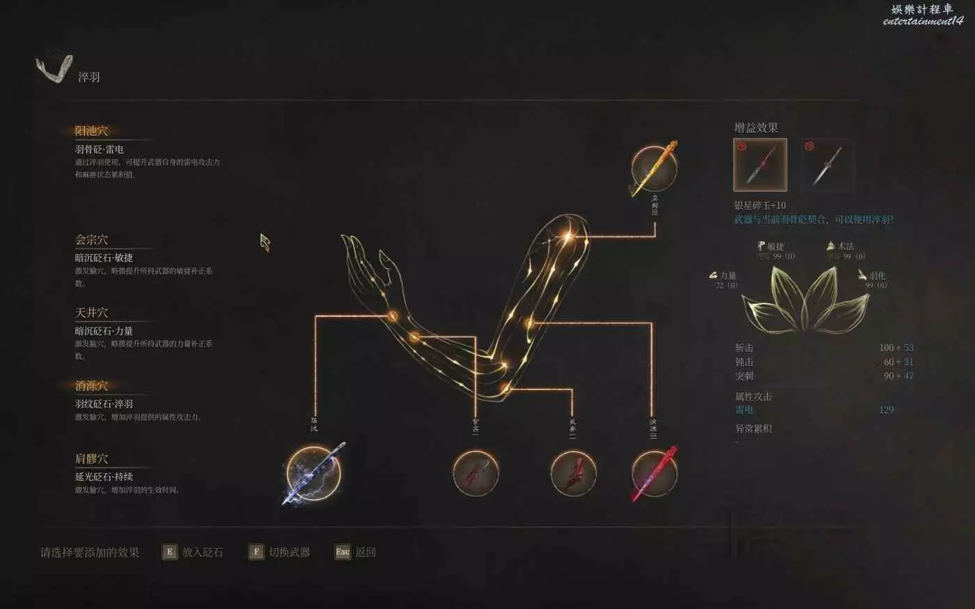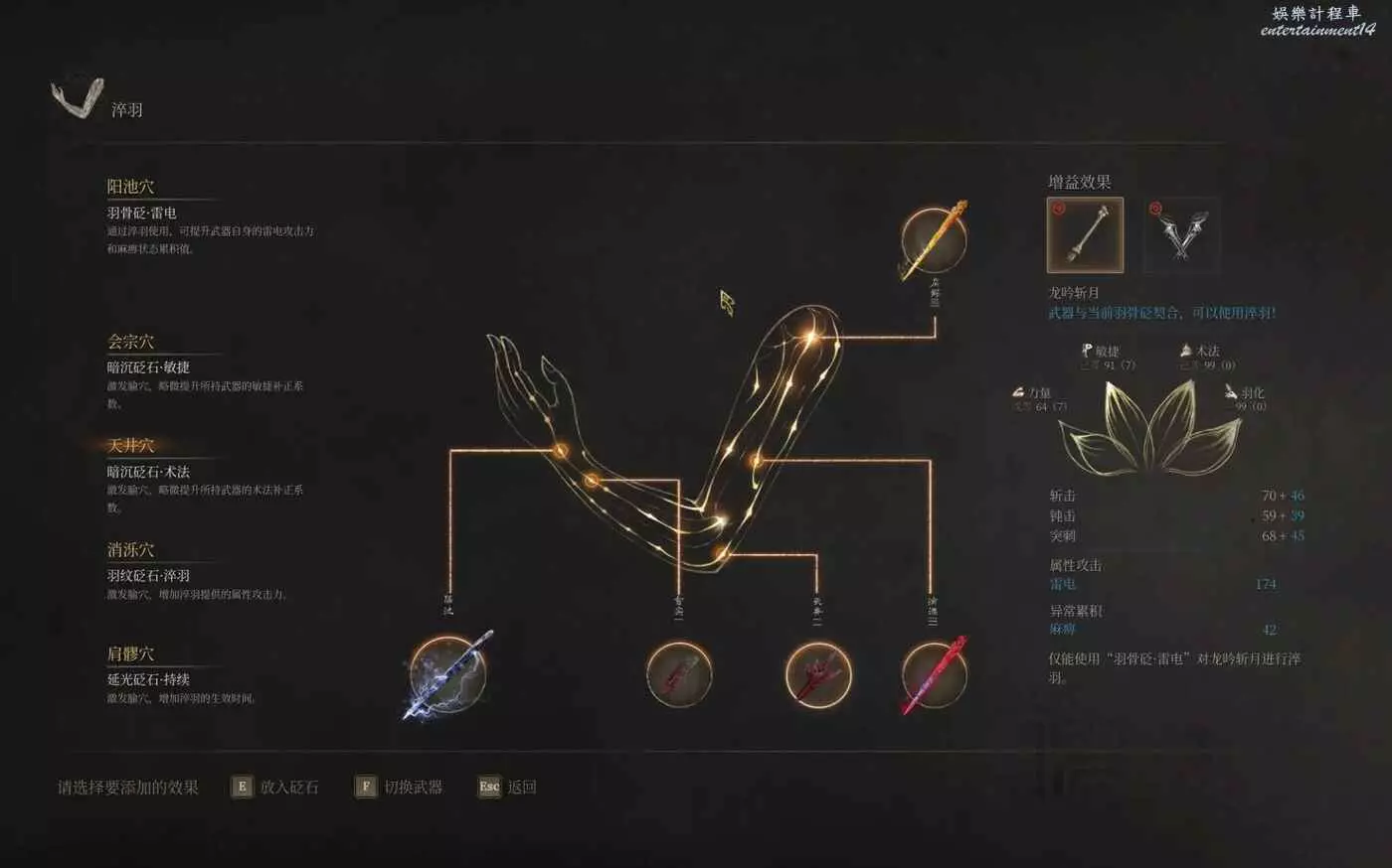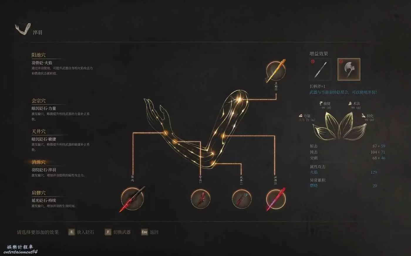 雷電、火焰、術法、羽化四種淬羽會增加傷害,其中火焰、雷電附帶的異常值機制與上文一致。